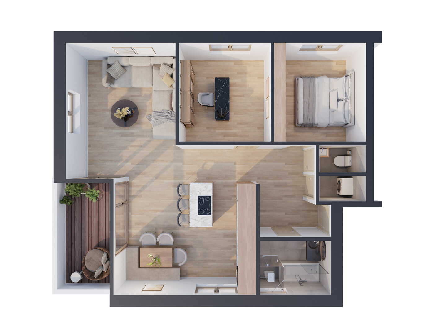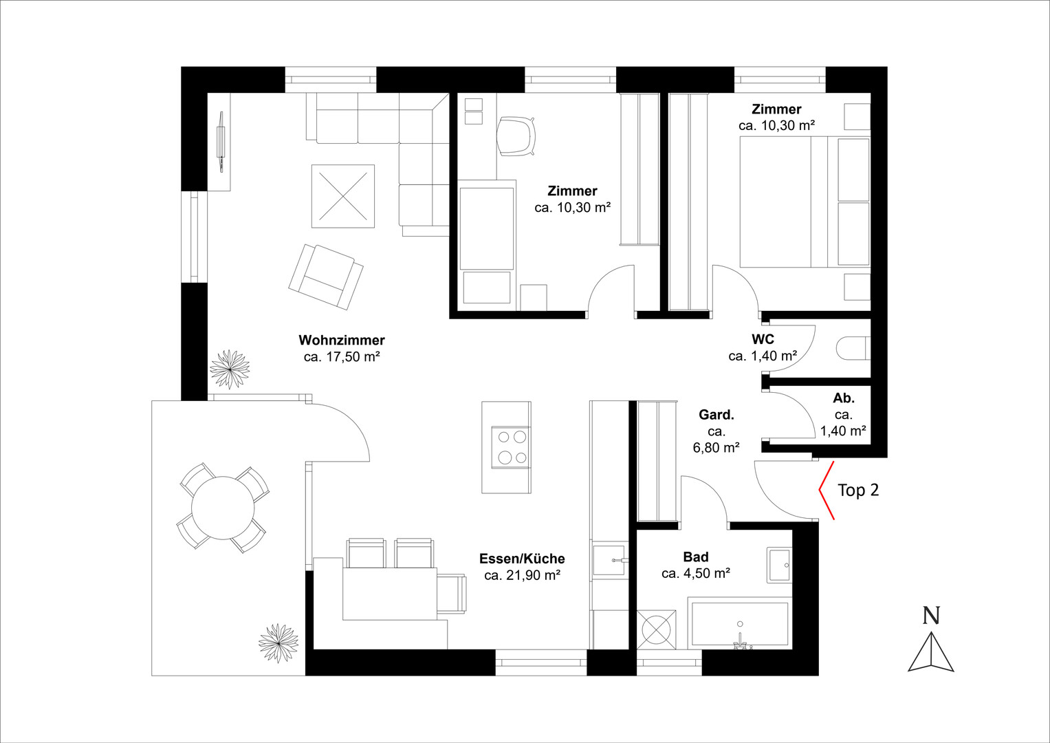 Top 02 ist eine hochwertig ausgestattete 3,5-Zimmer-Wohnung, die modernen Komfort mit einem harmonischen Wohnambiente verbindet. Der offen gestaltete Bereich für Essen und Kochen mit ca. 21,9 m² bildet das Herzstück der Wohnung und überzeugt durch seine einladende Atmosphäre. Ergänzt wird das Raumangebot durch zwei Schlafzimmer mit jeweils ca. 10,3 m², ein Wohnzimmer mit ca. 17,5 m², ein Badezimmer mit ca. 4,5 m², ein separates WC mit ca. 1,4 m², einen praktischen Abstellraum mit ca. 1,4 m² sowie eine großzügige Garderobe mit ca. 6,8 m². Der ca. 9,5 m² große Balkon erweitert den Wohnraum ins Freie und lädt zum Entspannen mit Blick ins Grüne ein. Ein eigenes Kellerabteil mit ca. 6,2 m² sorgt für zusätzlichen Stauraum.
