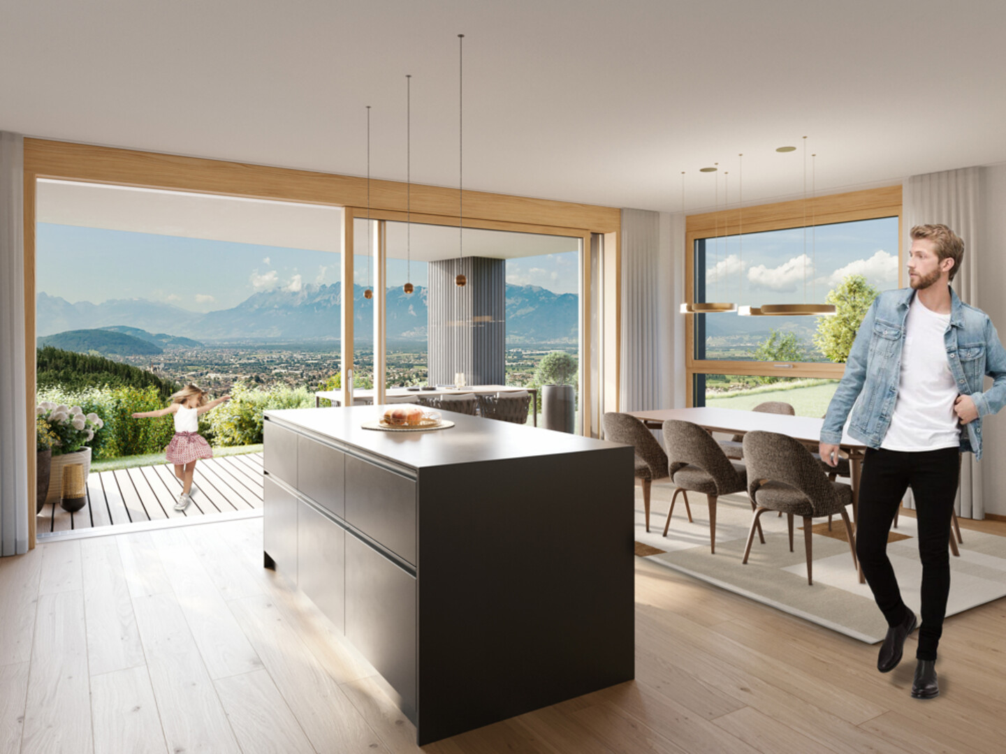 Traumhafte Terrassen und Gartenanteil mit Panoramablick auf das Rheintal und die Schweizer Berge. Für Paare und Familien ist die 4-Zimmer Wohnung mit Elternschlafzimmer und zwei Kinderzimmern verfügbar. Die Architektur zeichnet sich durch moderne Holzfassaden, hochwertige Holz-Alufenster, Eichendielenböden und elegante Sanitäranlagen aus. Parkplätze auf Straßenniveau mit direktem Zugang zum Lift gewährleisten eine komfortable Erreichbarkeit aller Ebenen. Die Anlage wird mit modernen, nachhaltigen Technologien wie Photovoltaik, einem fortschrittlichen Heizsystem und der Vorbereitung für E-Ladestationen ausgestattet. Weitere Annehmlichkeiten umfassen Besucherparkplätze, Fahrradstellplätze und einen Kleinkinderspielplatz. Ideal für alle, die hohen Wohnkomfort in einer lebenswerten Umgebung suchen.