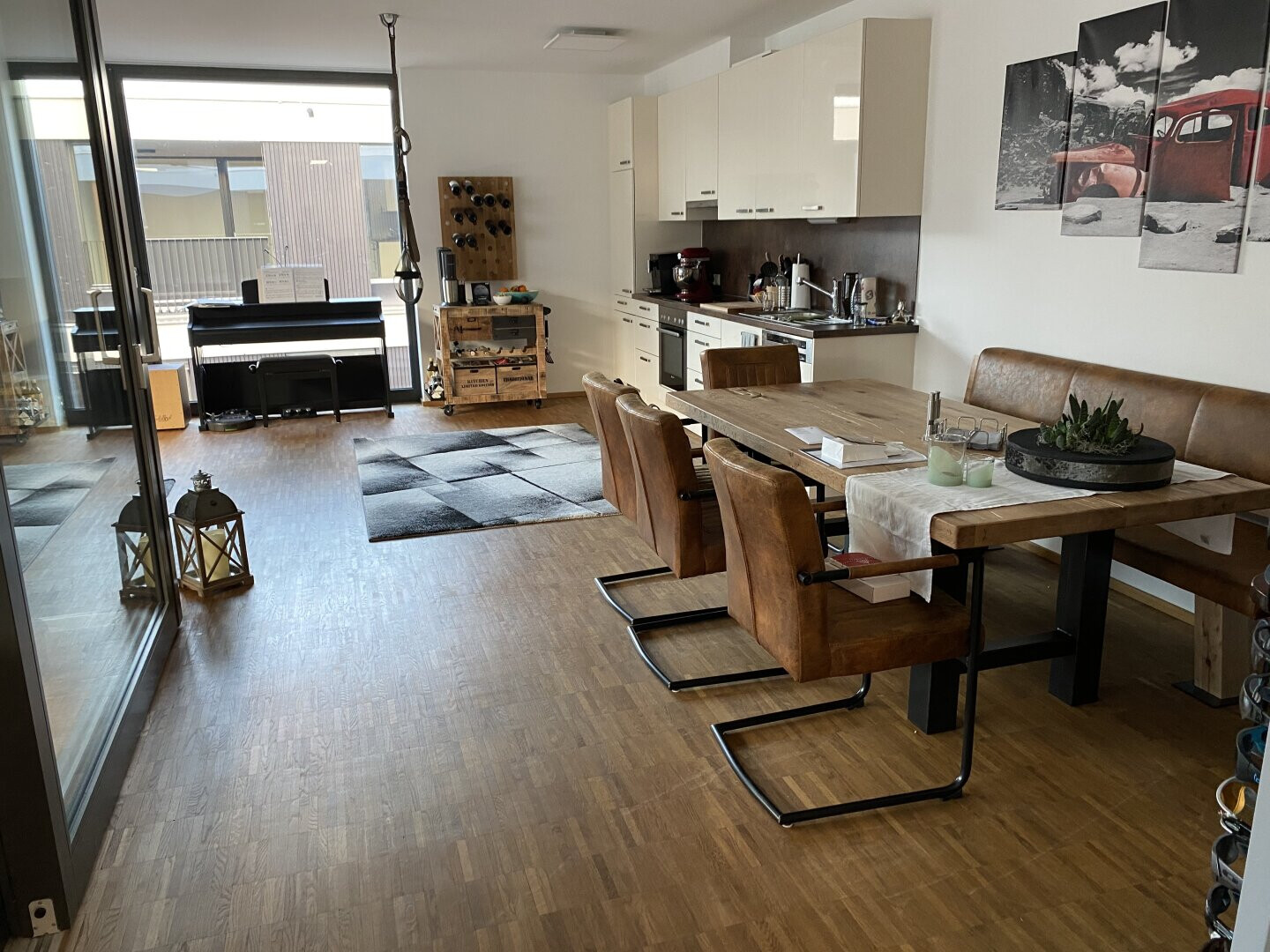 Der einladende, großzügige Wohn- und Essbereich verfügt über eine moderne weiße Einbauküche inklusive hochwertiger Geräte. Das Bad ist mit sandsteinfarbenen Feinsteinfliesen am Boden und weissen Hochglanzfliesen an der Wand ausgestattet. In allen Wohn- und Schlafräumen wurde hochwertiger Parkett verlegt.