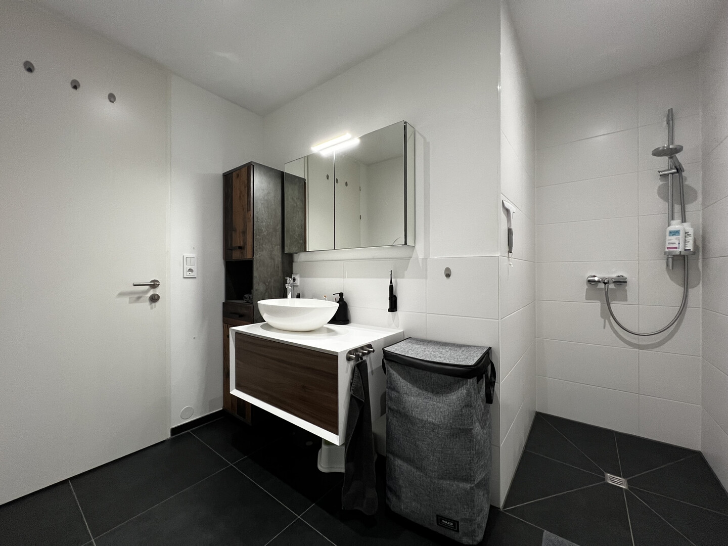 Das Badezimmer ist mit Fliesen versehen worden und verfügt über eine ebenerdige Dusche und ein WC. Ein modernes Waschbecken runden die Ausstattung im Badezimmer ab.