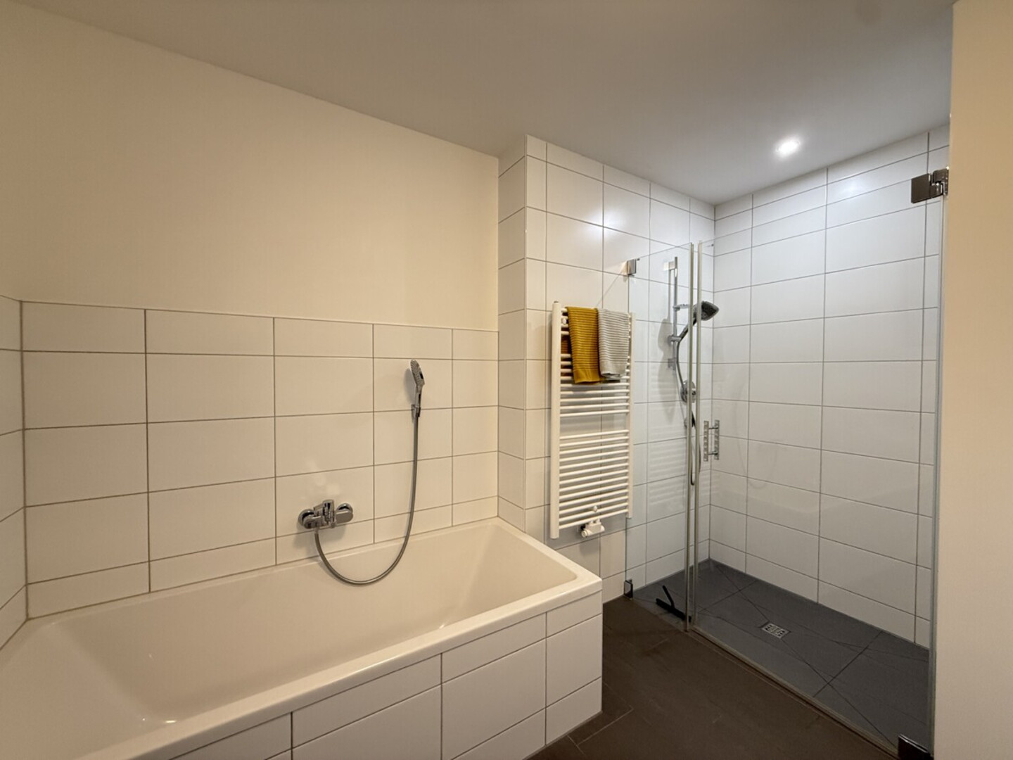 Der Wohn- und Essbereich präsentiert sich offen und einladend. Die integrierte Einbauküche ist in das Raumkonzept harmonisch eingebunden und ermöglicht ein komfortables Wohnen mit kurzen Wegen. Edler Eichenparkett sorgt in den Wohnräumen für ein warmes Ambiente, während Fliesen in den Nassbereichen pflegeleichte Funktionalität bieten.