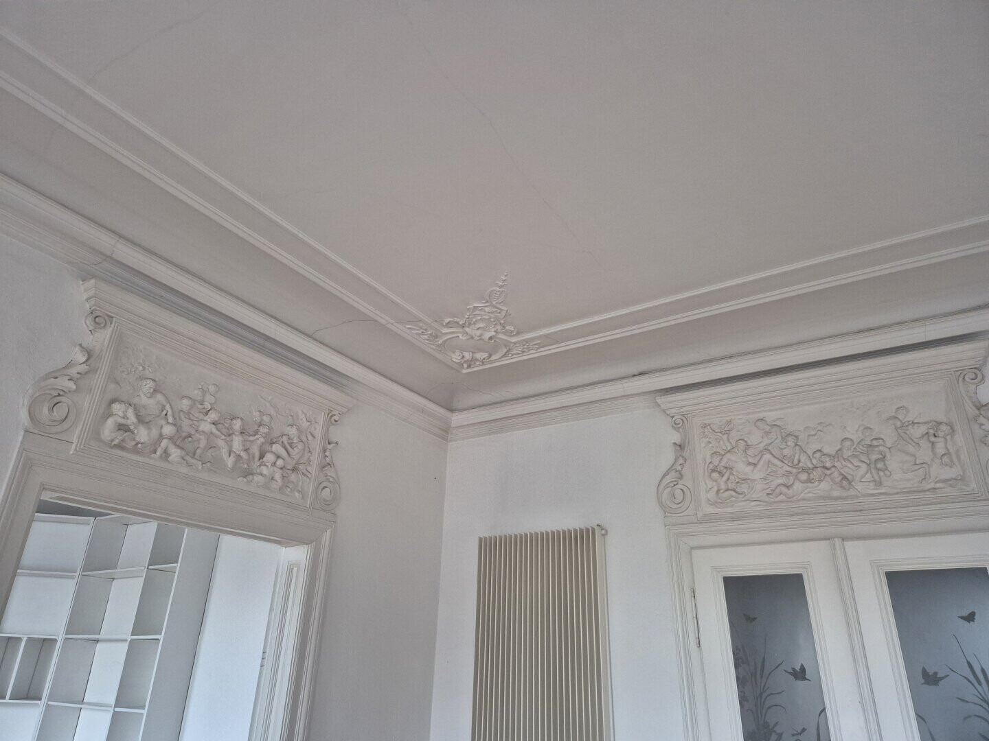 Die im 3. Stock gelegene Wohnung verfügt über wunderschöne Stuckdecken in den beiden großen Räumen (je ca. 30 m²). Die Flügeltüren mit geätzter Verglasung und stilvollen Ornamenten an den Türstöcken bieten gehobenen Altbauflair. Die Raumhöhe von 3,70 Meter ist beeindruckend.