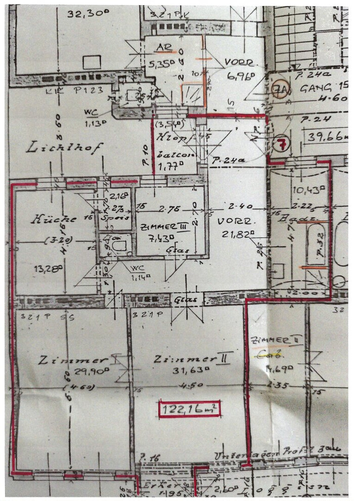 Bestehend 2 großzügigen Zimmern, 1 kleineres Zimmer, Küche mit Speis, Vorraum, Bad (10m²) sowie einen kleinen Balkon mit 2 m² an der Hausfront sowie einen Klopf-Balkon in den Innenhof.