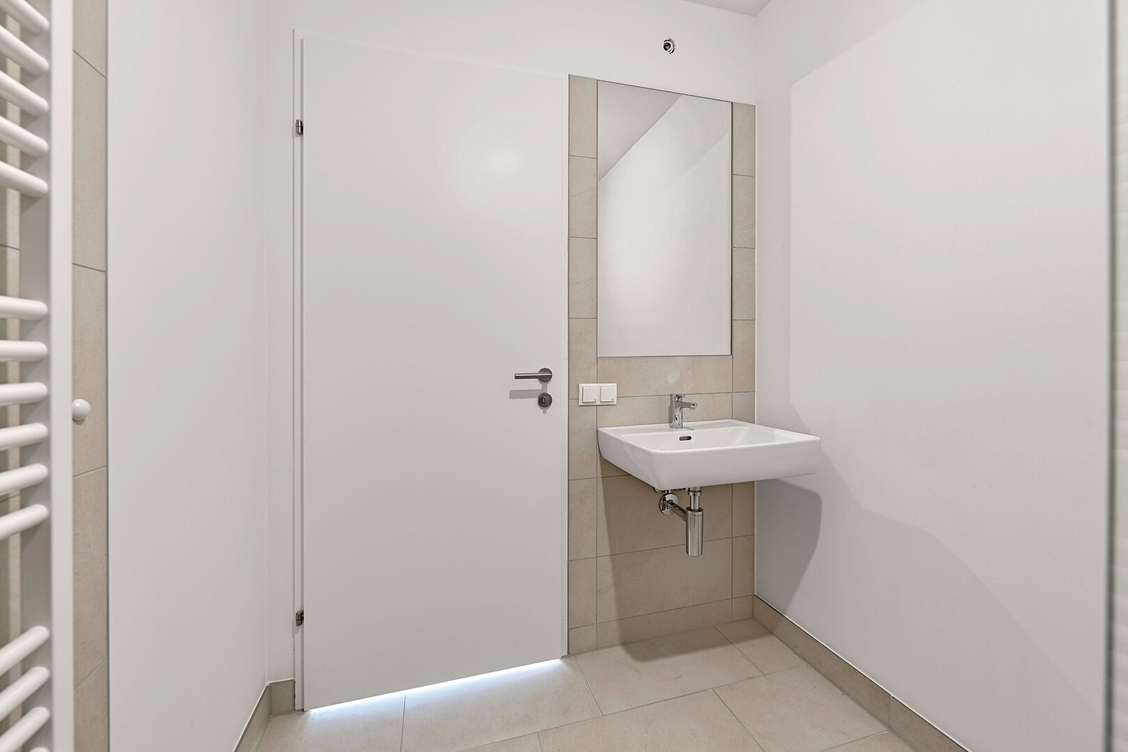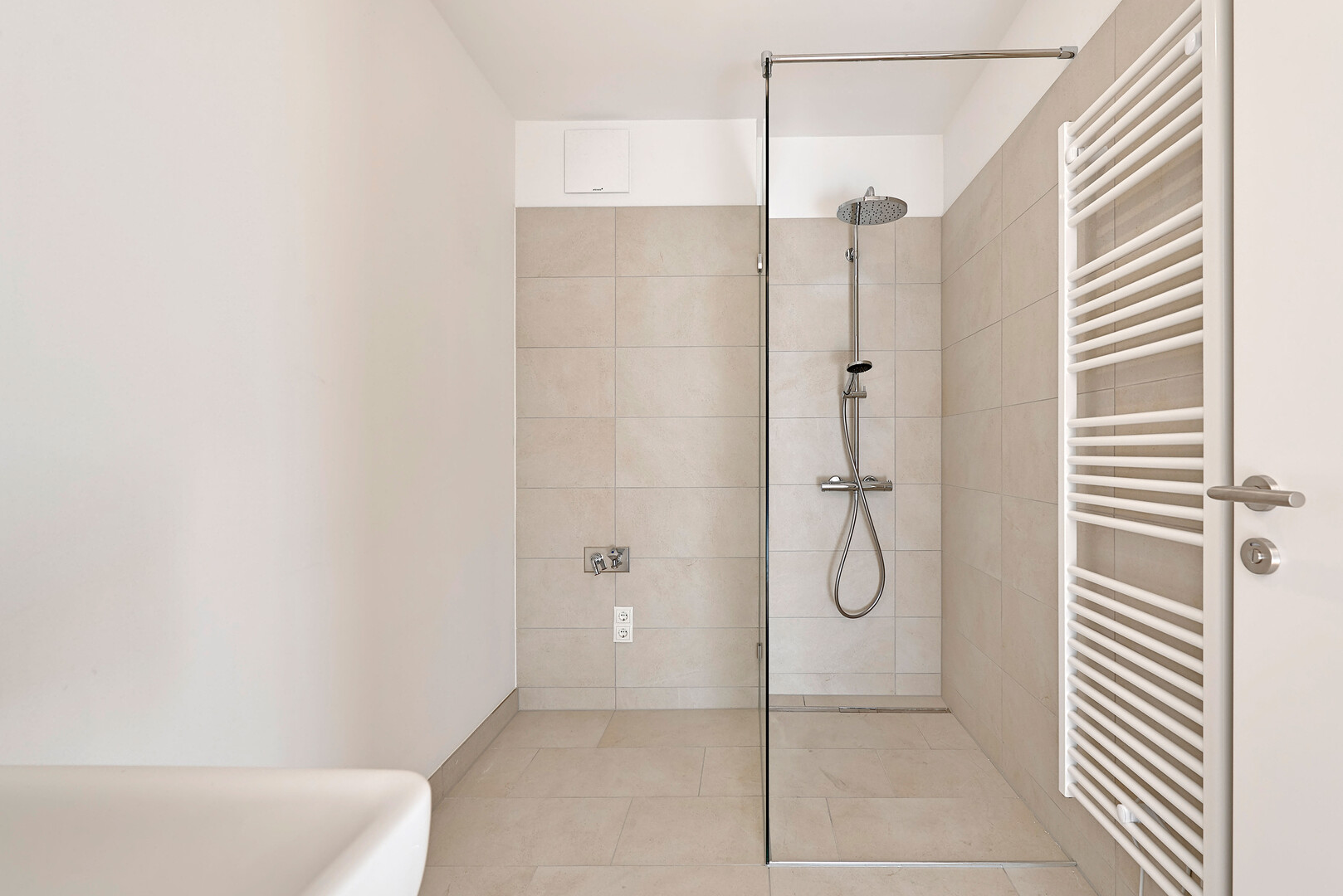 - Badezimmer mit Dusche, Handwaschbecken und Waschmaschinenanschluss