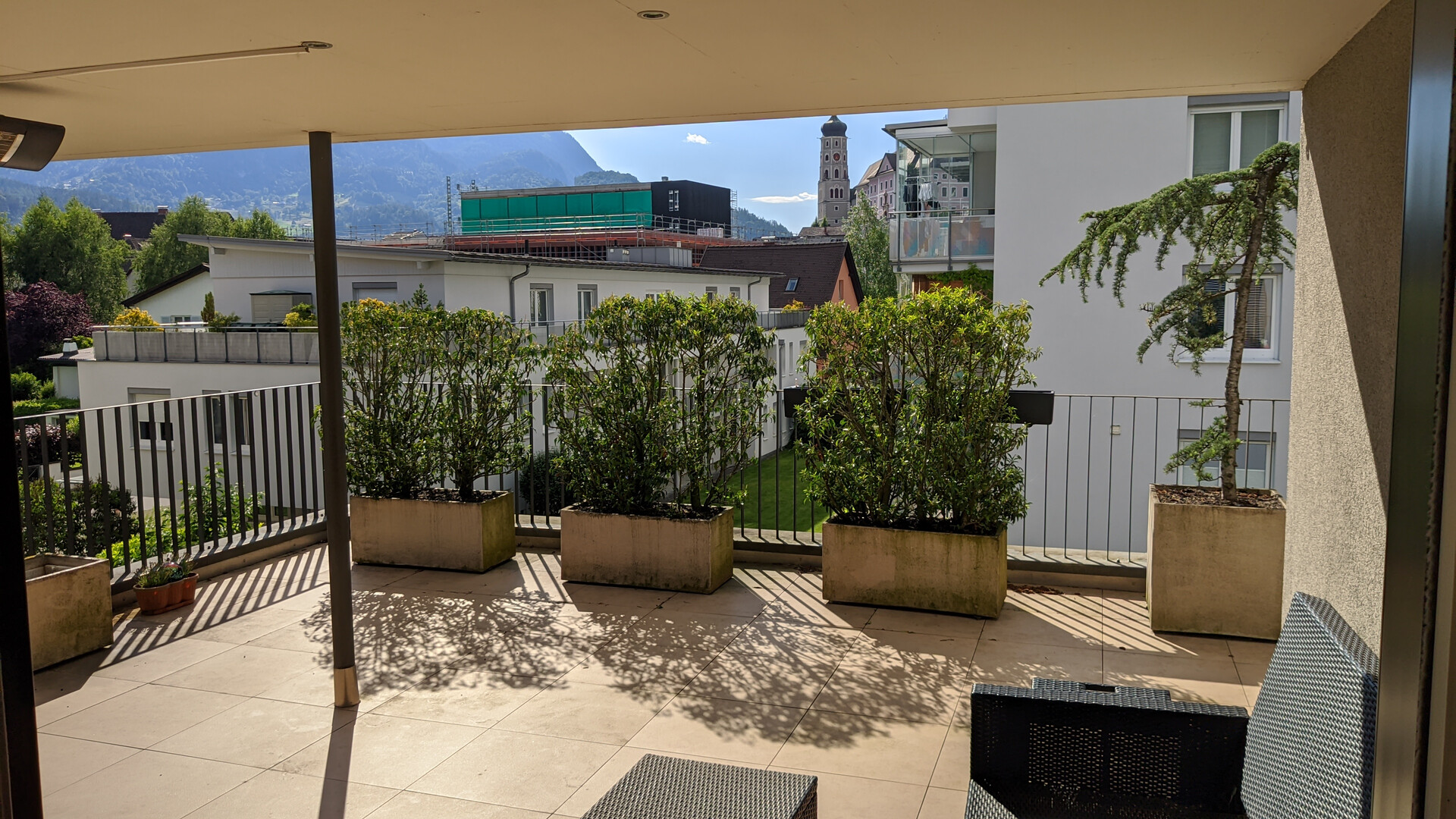 Die in einer Kleinwohnanlage gelegene Dachgeschoßwohnung ist leicht durch den Lift von der Tiefgarage oder dem Haupteingang zu erreichen. Durch die mit Tischlermöbeln ausgestattete Garderobe gelangen Sie in die beiden Schlafzimmer oder in den großzügigen und lichtdurchfluteten Wohn- Essbereich. Die riesige beheizbare und Großteils überdachte Terrasse ist von allen Zimmern aus zugänglich. Hier können Sie den Sonnenuntergang über der herrlichen Bergkulisse genießen.