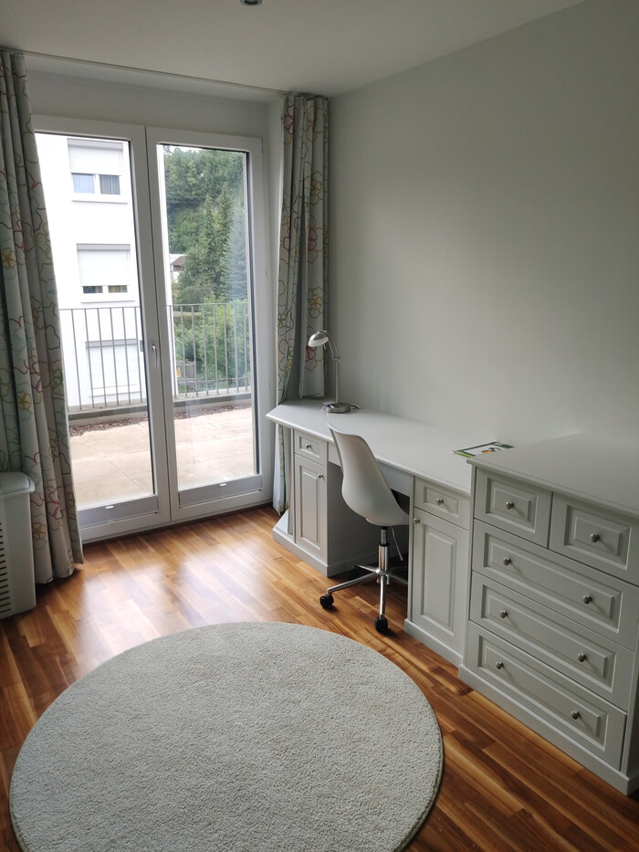 Die Wohnung verfügt über ein großes Schlaf- und ein Gästezimmer, welches auch als Arbeitszimmer genutzt werden kann. Ein helles Bad mit Badewanne und Dusche, ein Abstellraum sowie ein Gäste-WC gehören zum Raumprogramm. Zur Wohnung gehört ein Tiefgaragenplatz, von dem aus Sie mit dem Lift direkt vor die Wohnungstüre gelangen.