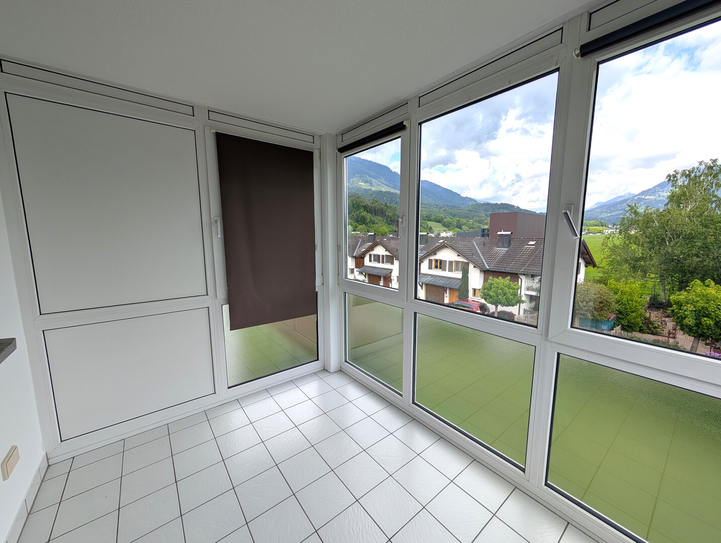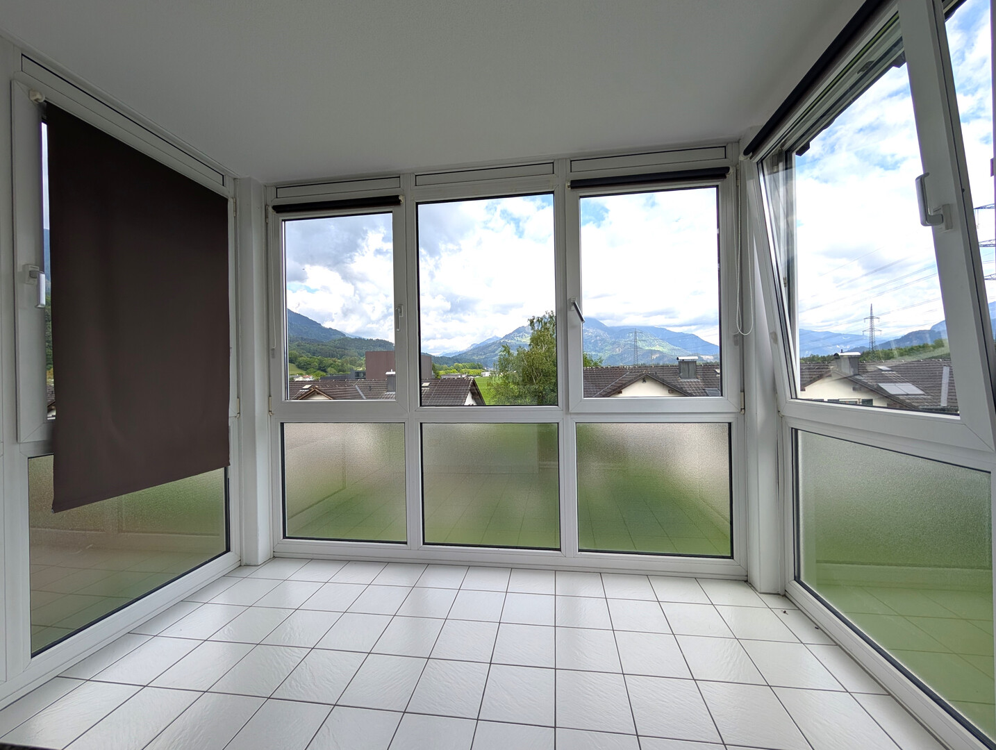 Der Balkon ist verglast und bietet einen herrlichen Ausblick in die schöne Natur und Bergwelt.
