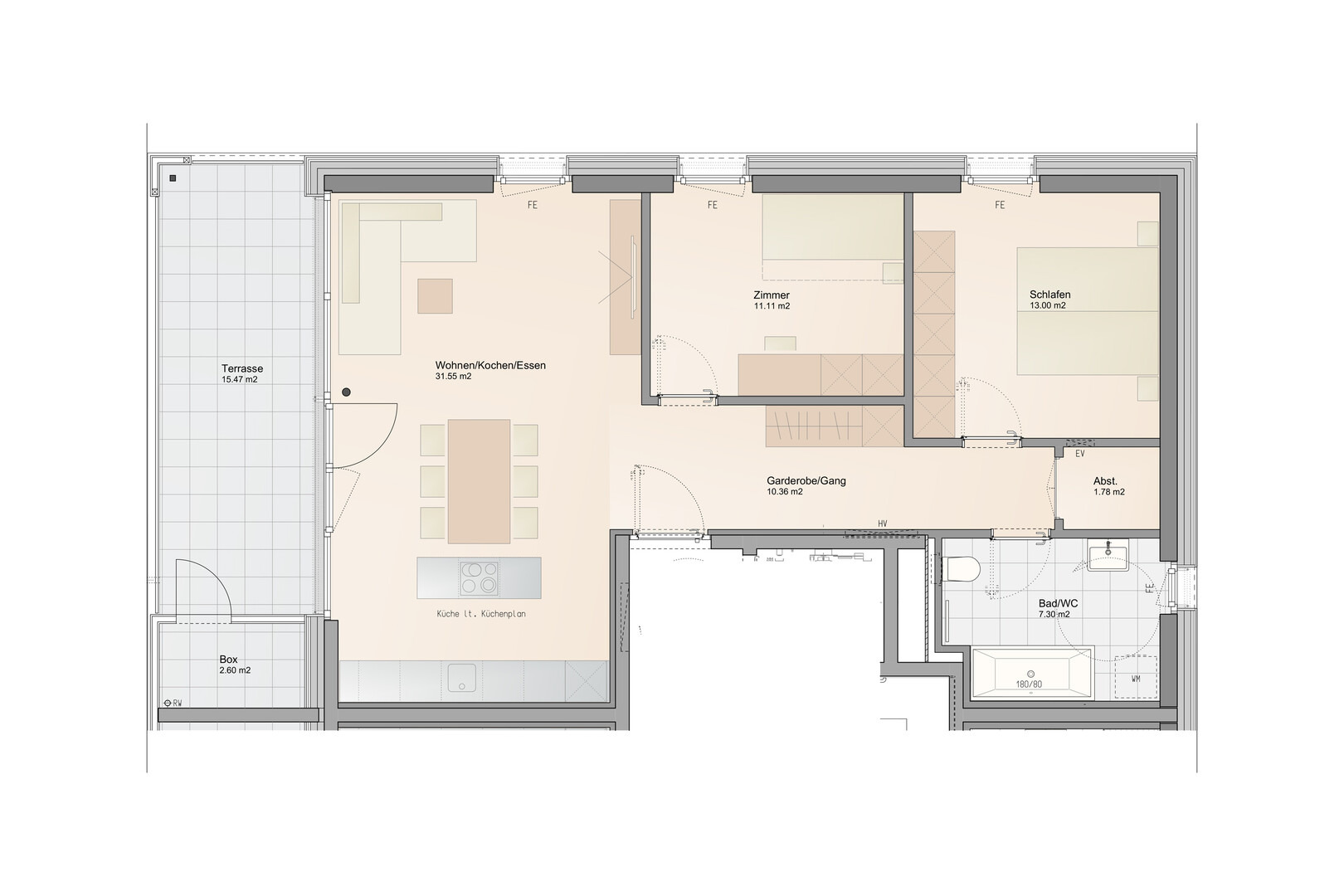 Die extensive Begrünung der Flachdächer, die neben den Photovoltaikanlagen realisiert wird, stellt nicht nur eine ökologisch wertvolle Nutzung der Fläche dar, sondern birgt an heißen Sommertagen auch einen kühlenden Effekt. Die hauseigene Tiefgarage, private Kellerabteile, ein Kinderspielplatz und Besucherparkplätze komplettieren das stimmige Wohnensemble.