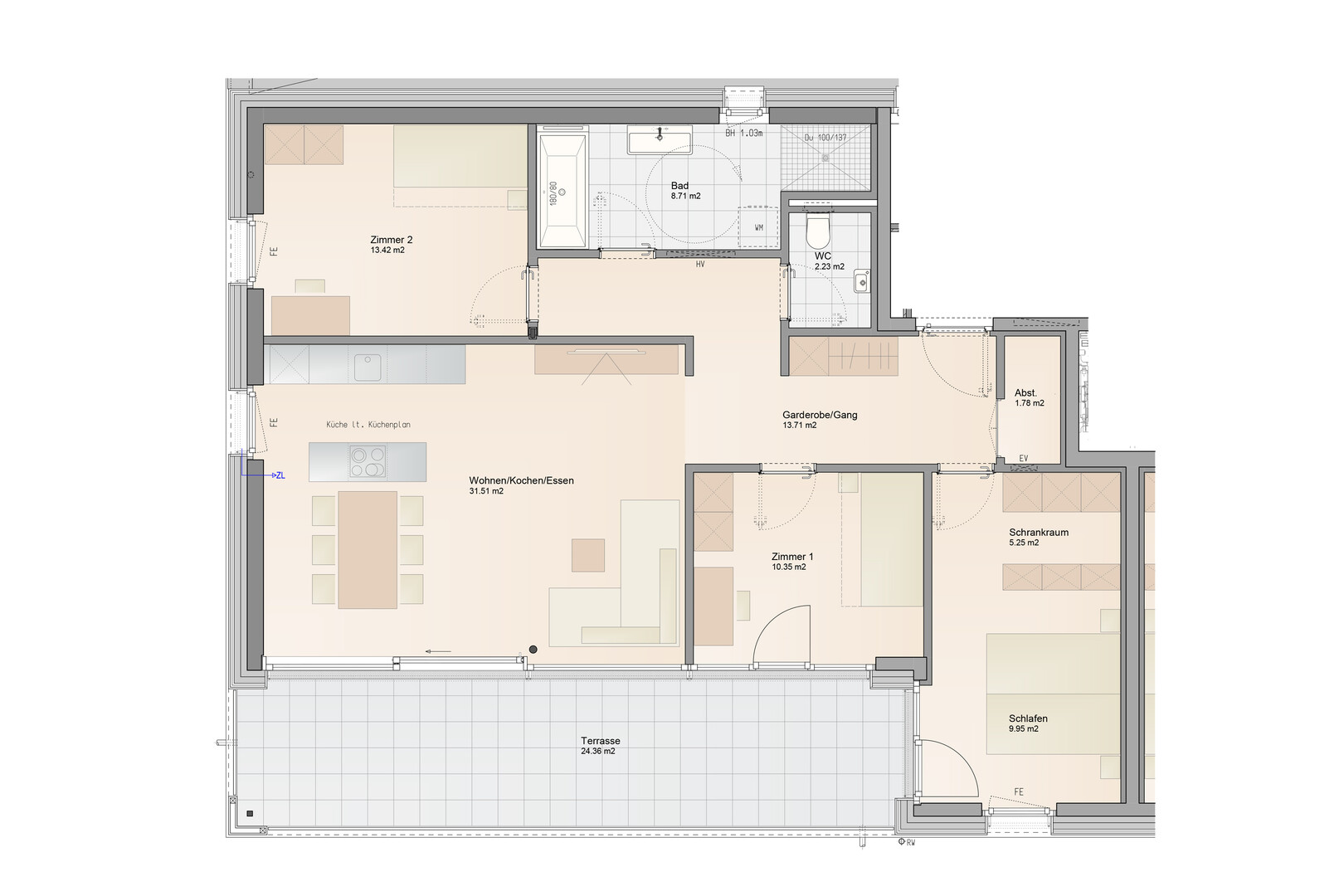 Die extensive Begrünung der Flachdächer, die neben den Photovoltaikanlagen realisiert wird, stellt nicht nur eine ökologisch wertvolle Nutzung der Fläche dar, sondern birgt an heißen Sommertagen auch einen kühlenden Effekt. Die hauseigene Tiefgarage, private Kellerabteile, ein Kinderspielplatz und Besucherparkplätze komplettieren das stimmige Wohnensemble.