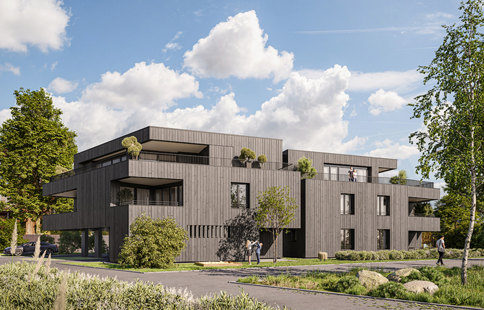 Die Architektur des Neubauprojekts Ofenstraße vereint Moderne und Naturverbundenheit: Eine stilvolle Holzfassade sorgt für eine harmonische Eingliederung in die Umgebung und vermittelt eine warme, behagliche Wohnatmosphäre. Große Fensterfronten öffnen den Blick in die grüne Umgebung und lassen die Innenräume in natürlichem Licht erstrahlen.