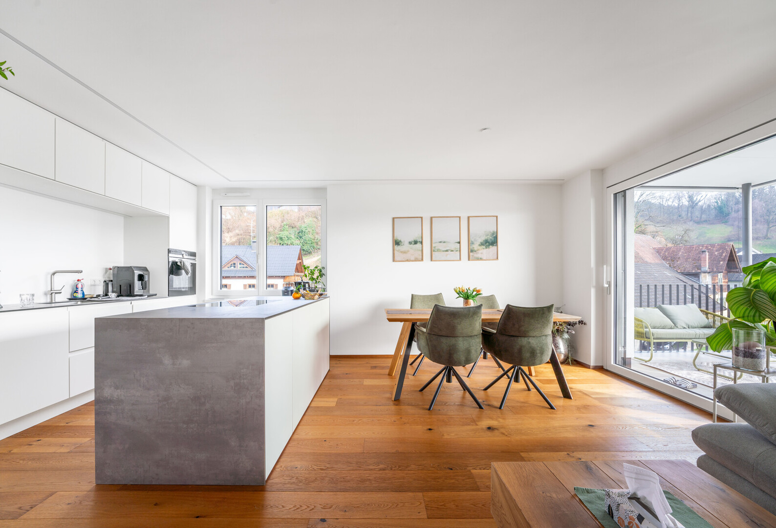 Die Wohnung überzeugt durch eine moderne Ausstattung mit Eichen-Landhausdielenparkett, raumhohen Stockrahmentüren, stilvoller Tischlerküche sowie integrierter LED-Stripes-Beleuchtung, die für ein angenehmes Wohnambiente sorgt. Vom hellen Wohn- und Essbereich gelangt man direkt auf die großzügige Süd-Terrasse.