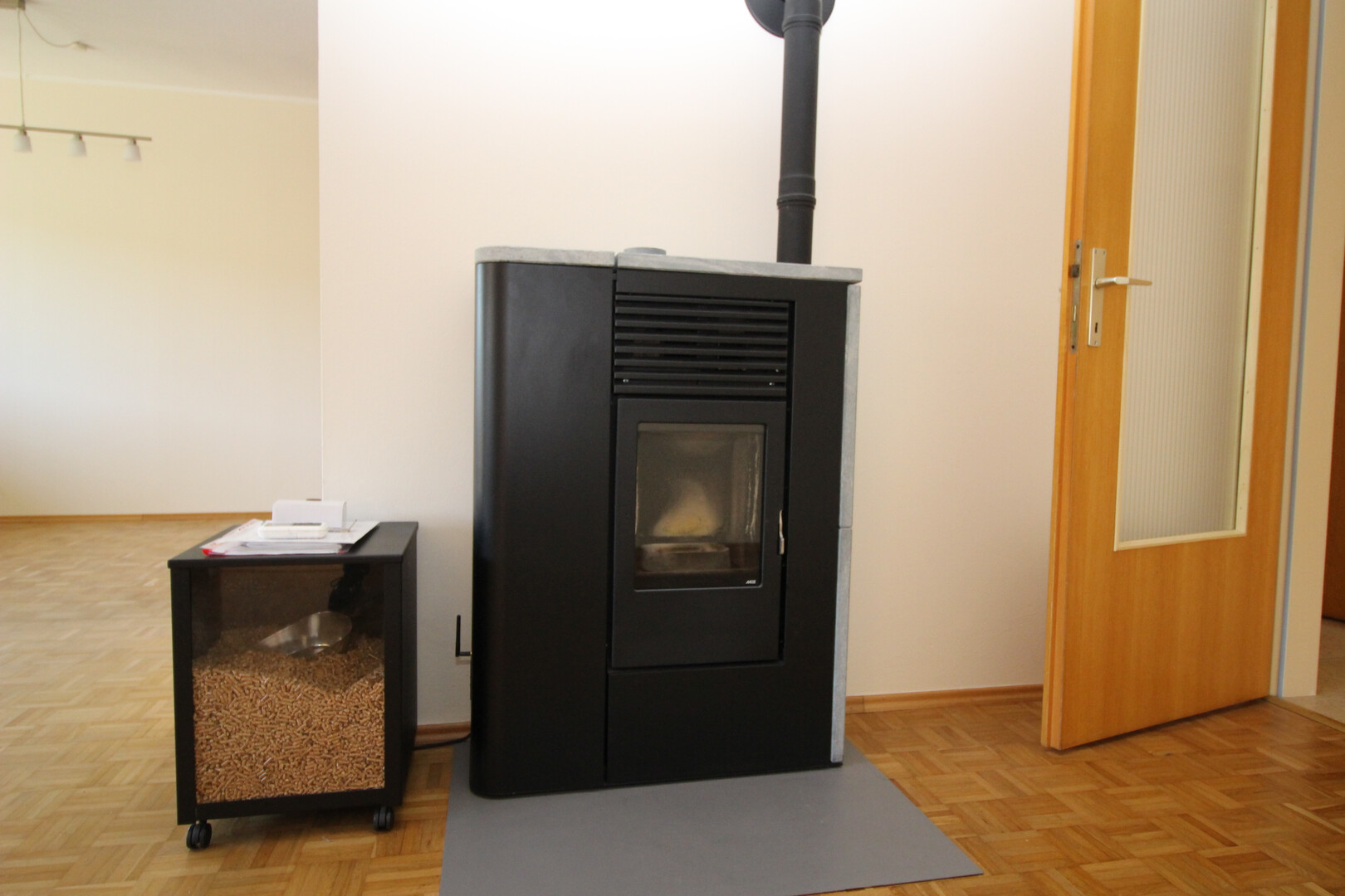 Derzeit wird die Wohnung über eine Elektroheizung beheizt. Zusätzlich steht ein sehr effizienter Pelletsofen zur Verfügung.