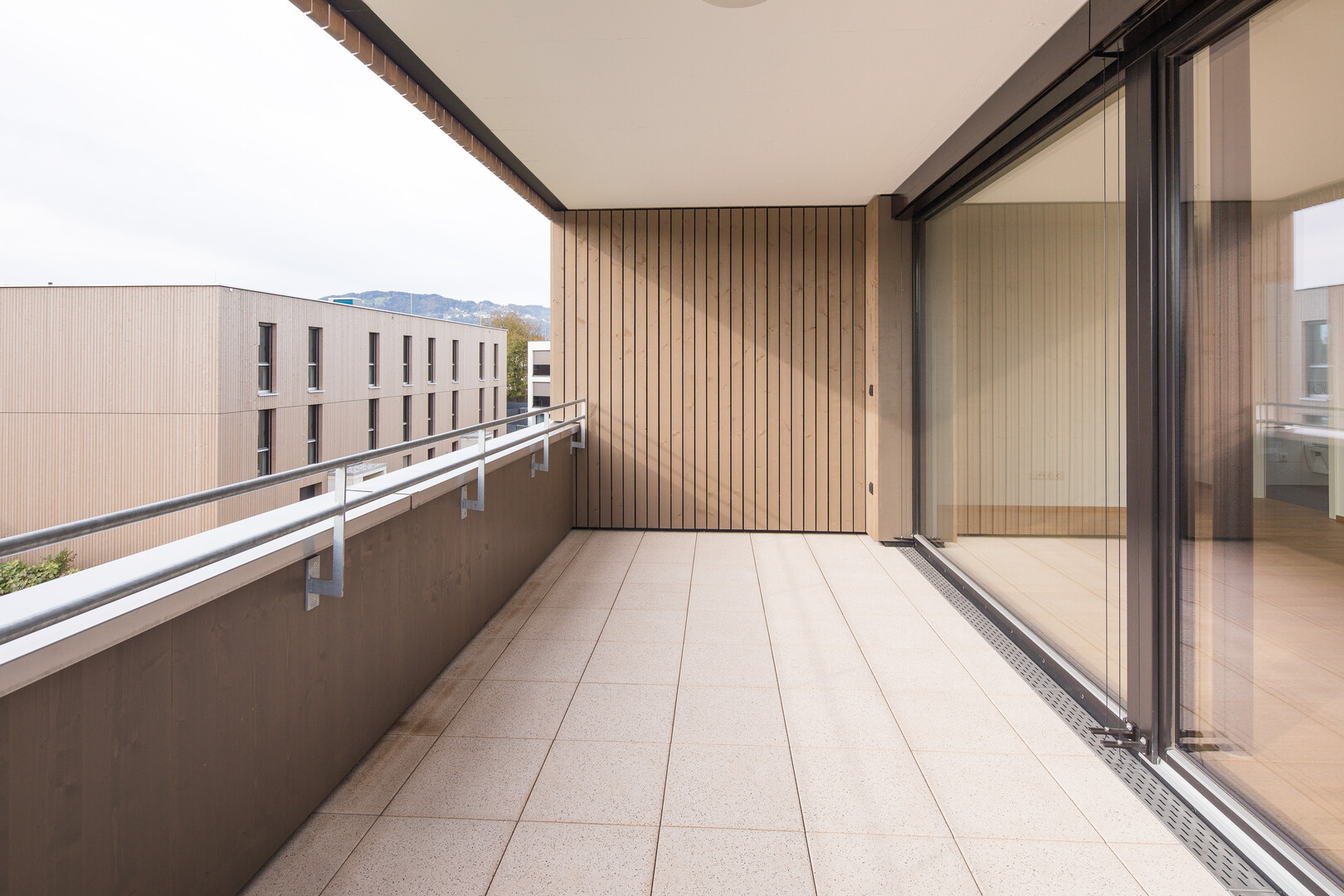 Sonnige Wohnqualität: Die überdachte Terrasse dieser Obergeschosswohnung schafft ein geschütztes Outdoor-Wohnzimmer, das zu jeder Jahreszeit genutzt werden kann. Genießen Sie die Aussicht und das helle, offene Wohnkonzept.