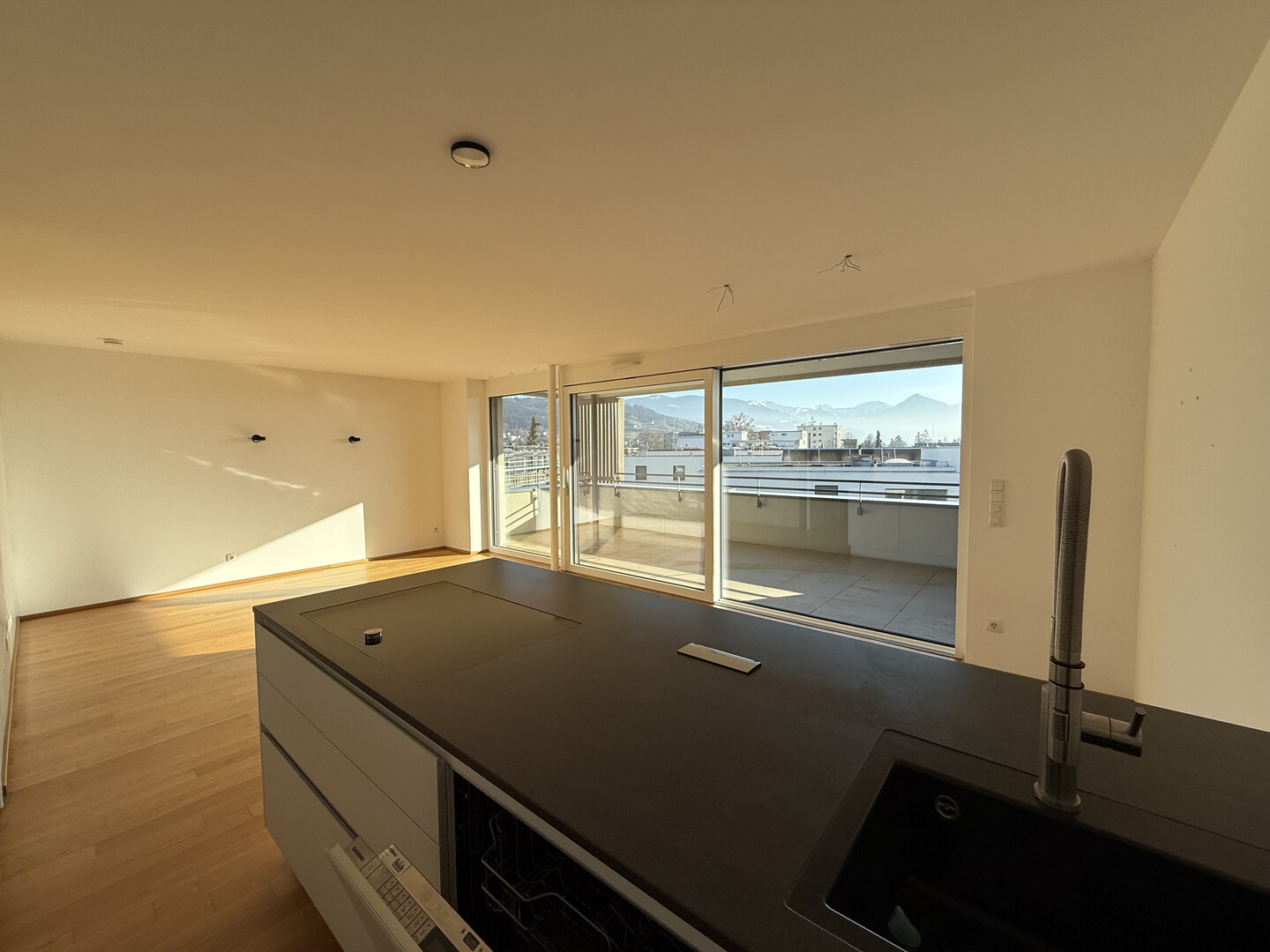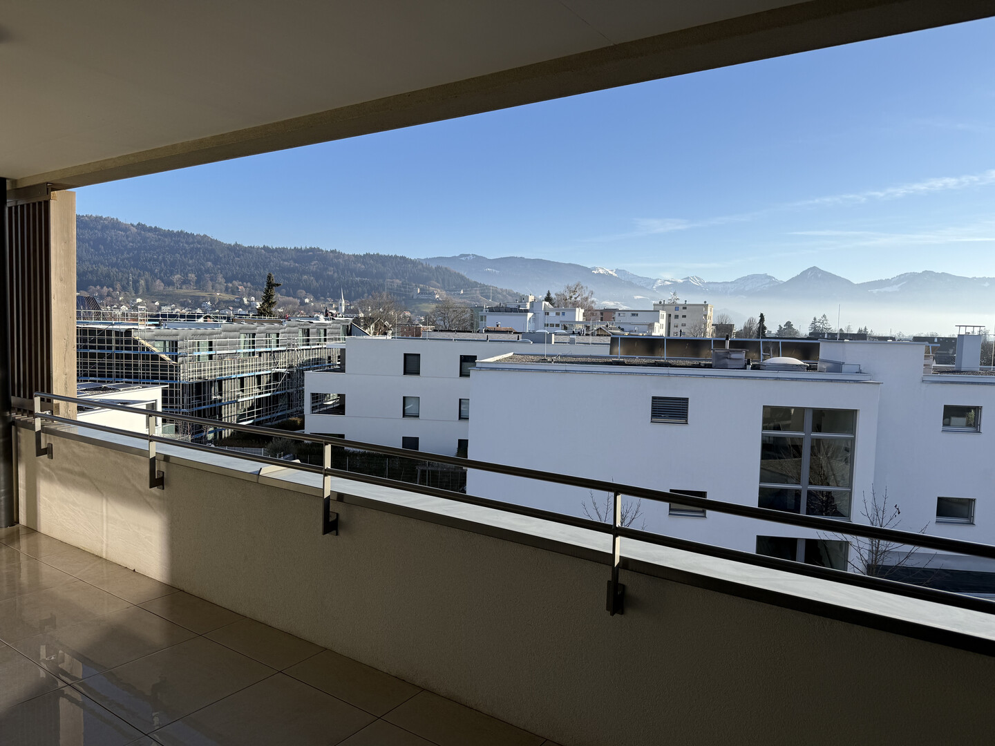 Ein besonderes Highlight ist der nach Süden ausgerichtete Balkon mit Blick auf Schloss Wolfurt.