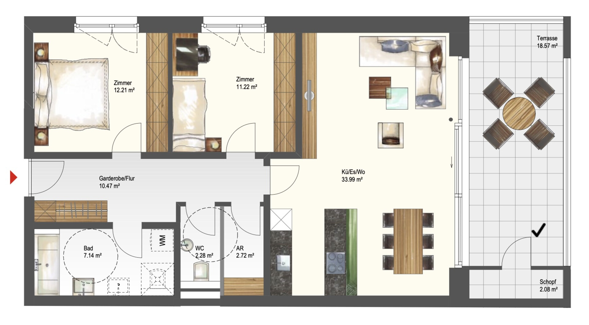 - 2 Schlafzimmer, großer Wohn- und Essbereich mit moderner Küche, Bad mit separatem WC und Abstellraum
