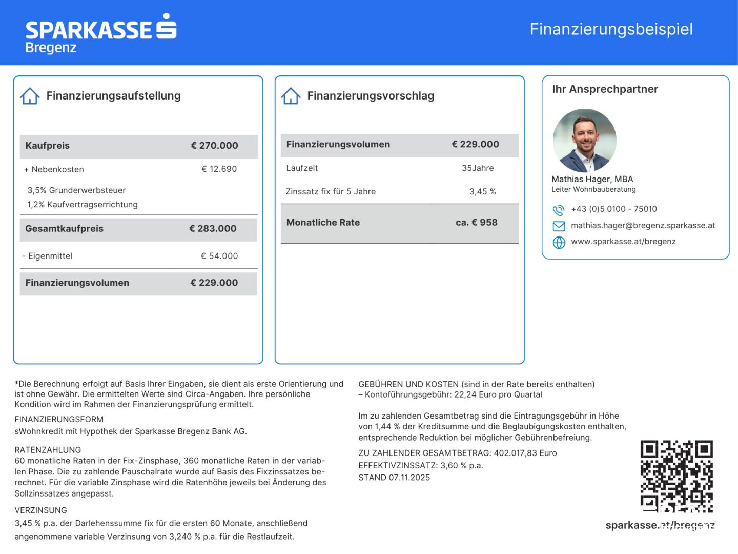 Sie wünschen eine unverbindliche Finanzierungsberatung für den Kauf des gegenständlichen Objekts? Nützen Sie die Vorteile unseres Unternehmens als Teil der Sparkassen-Unternehmensgruppe! Der zuständige Immobilienmakler der Sparkassen REAL Vorarlberg Immobilienvermittlung GmbH arrangiert Ihnen gerne eine unverbindliche Finanzierungsberatung bei den Wohnbauspezialisten der Vorarlberger Sparkassen.