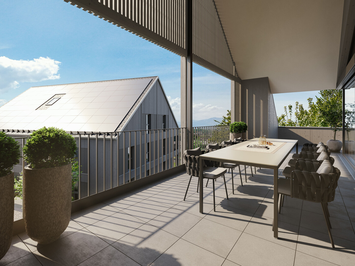 Diese Wohnung im Dachgeschoss verfügt über eine großzügige Terrasse mit Weitsicht auf das Rheintal und die umliegenden Berge. Hier lässt sich die Aussicht in vollen Zügen genießen – sei es beim Frühstück im Freien oder beim Entspannen nach einem langen Tag.