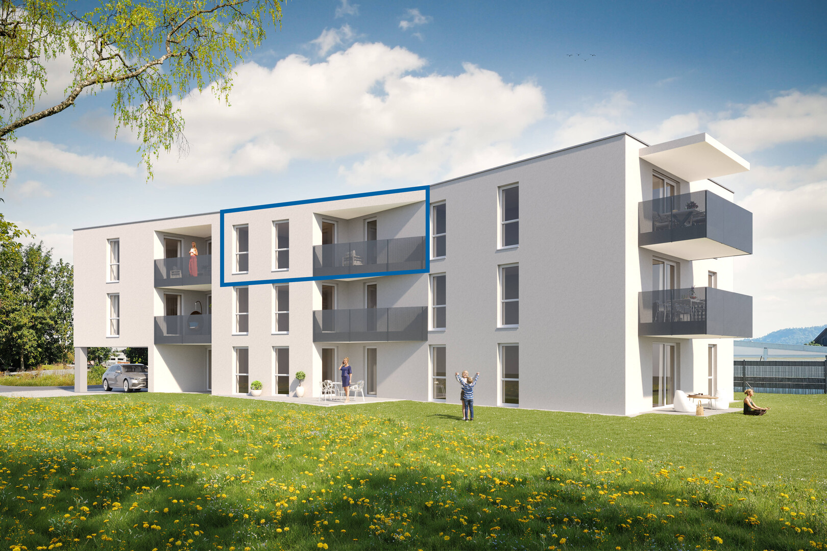 Im Erdgeschoss stehen Ihnen Carports, Außenabstellplätze und ein geschlossener Fahrradraum zur Verfügung. Ihre Wohnung erreichen Sie barrierefrei über den Lift.