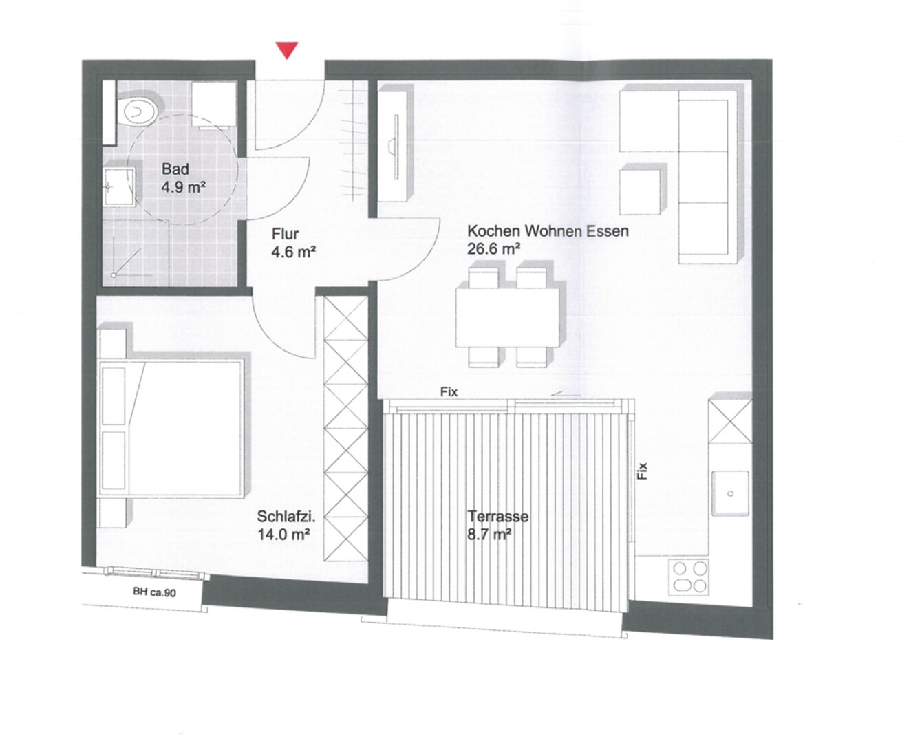 Die Wohnung besteht aus einem Vorraum, einem großzügigen Wohn/Essbereich mit Einbauküche.