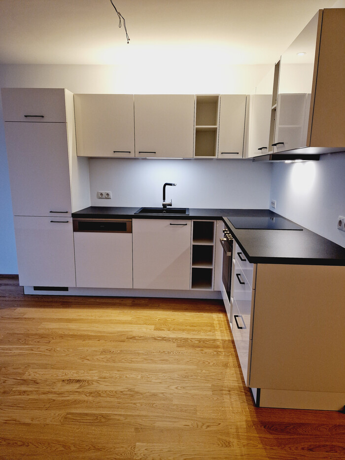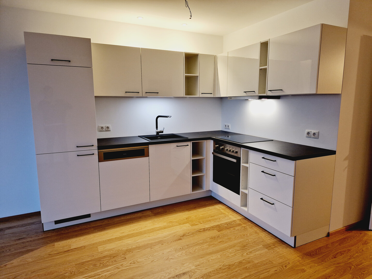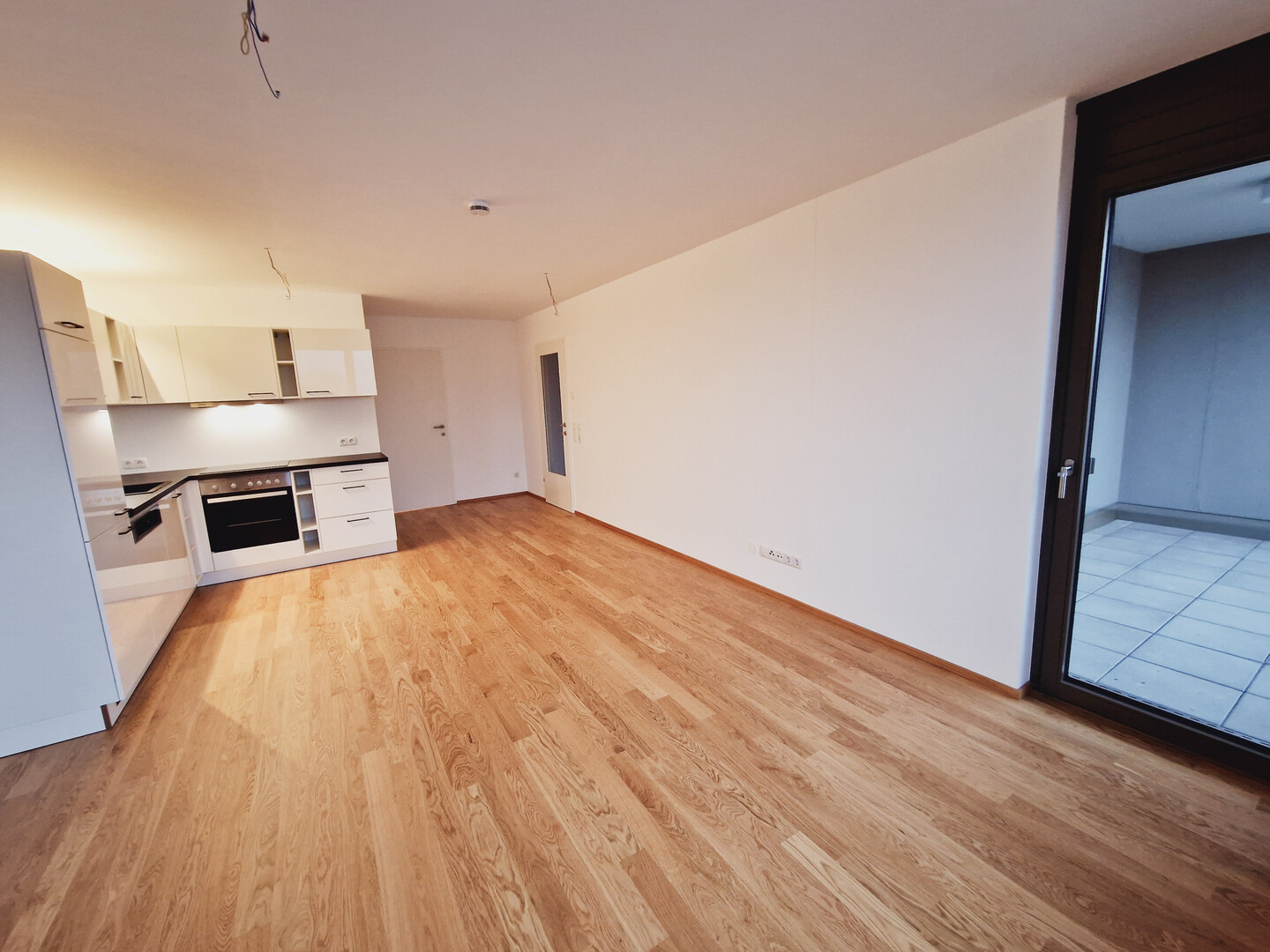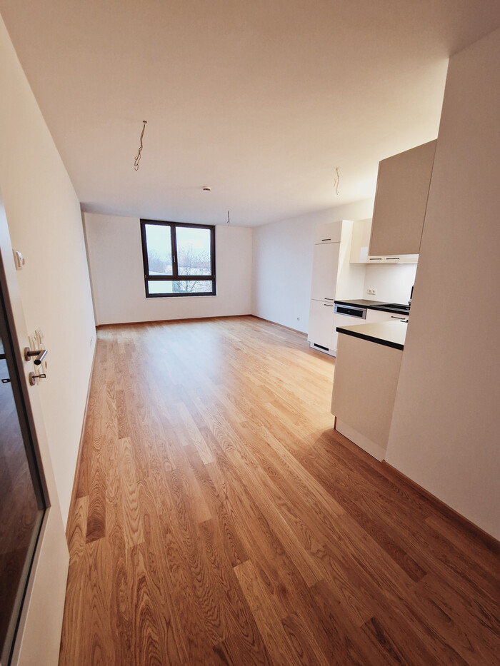 - Wohn-Essbereich mit hochwertigem Parkett, offener Küche und direktem Zugang zum Balkon