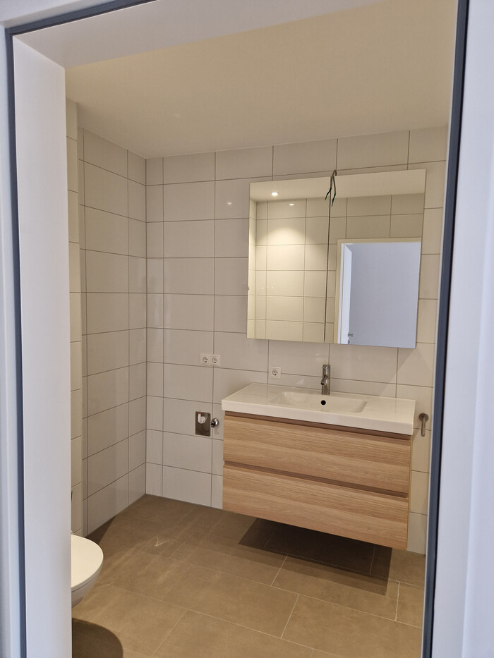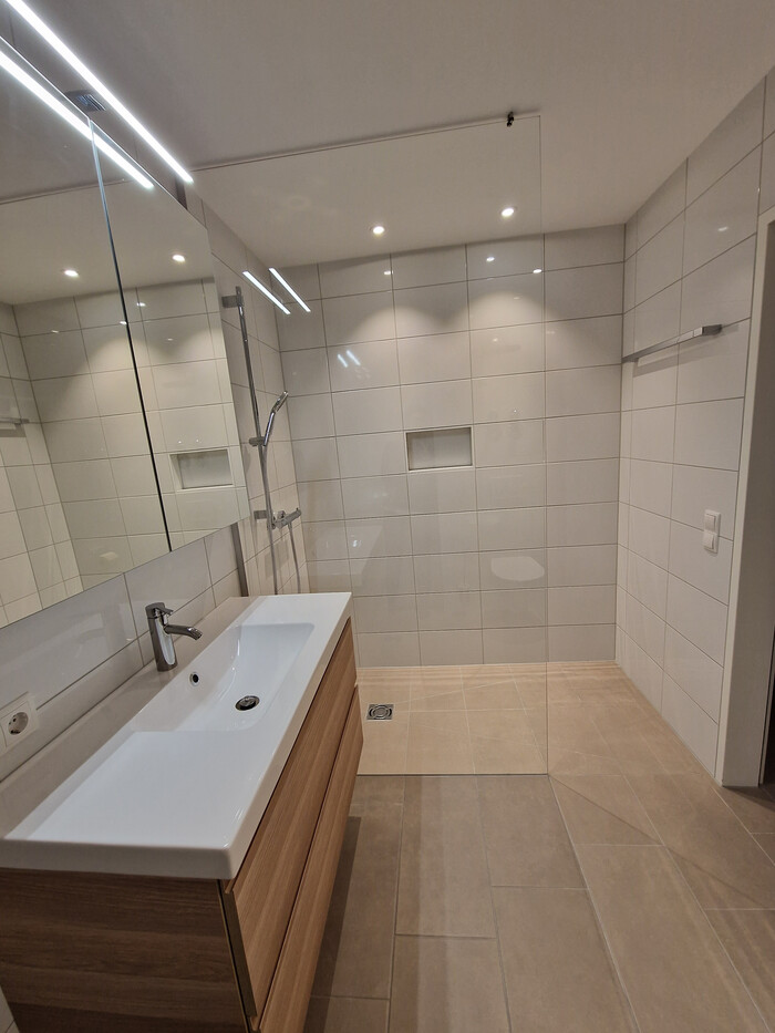 - Badezimmer mit bodengleicher Dusche, WC, Waschtisch mit Spiegelschrank und Waschmaschinenanschluss