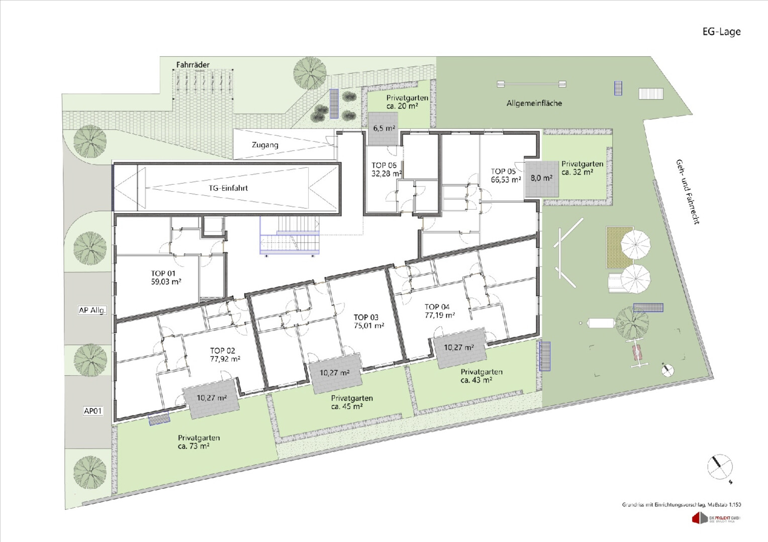 Im großzügigen Untergeschoß des Mehrfamilienwohnhauses befindet sich neben den Allgemeinräumen und den Kellerräumen eine Tiefgarage mit überbreiten Tiefgaragenplätzen (2,70m) mit Vorbereitung zur Elektromobilität.
