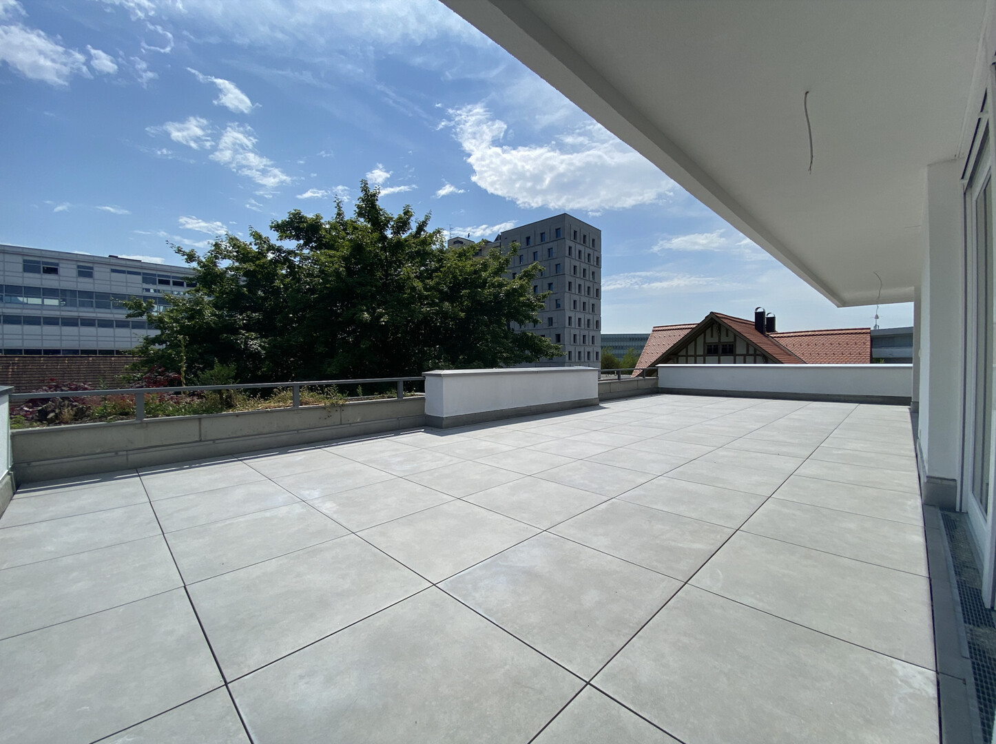Die große, südseitig ausgerichtete Terrasse ist gleichzeitig aus dem Wohnbereich und dem Hauptschlafzimmer zugänglich.