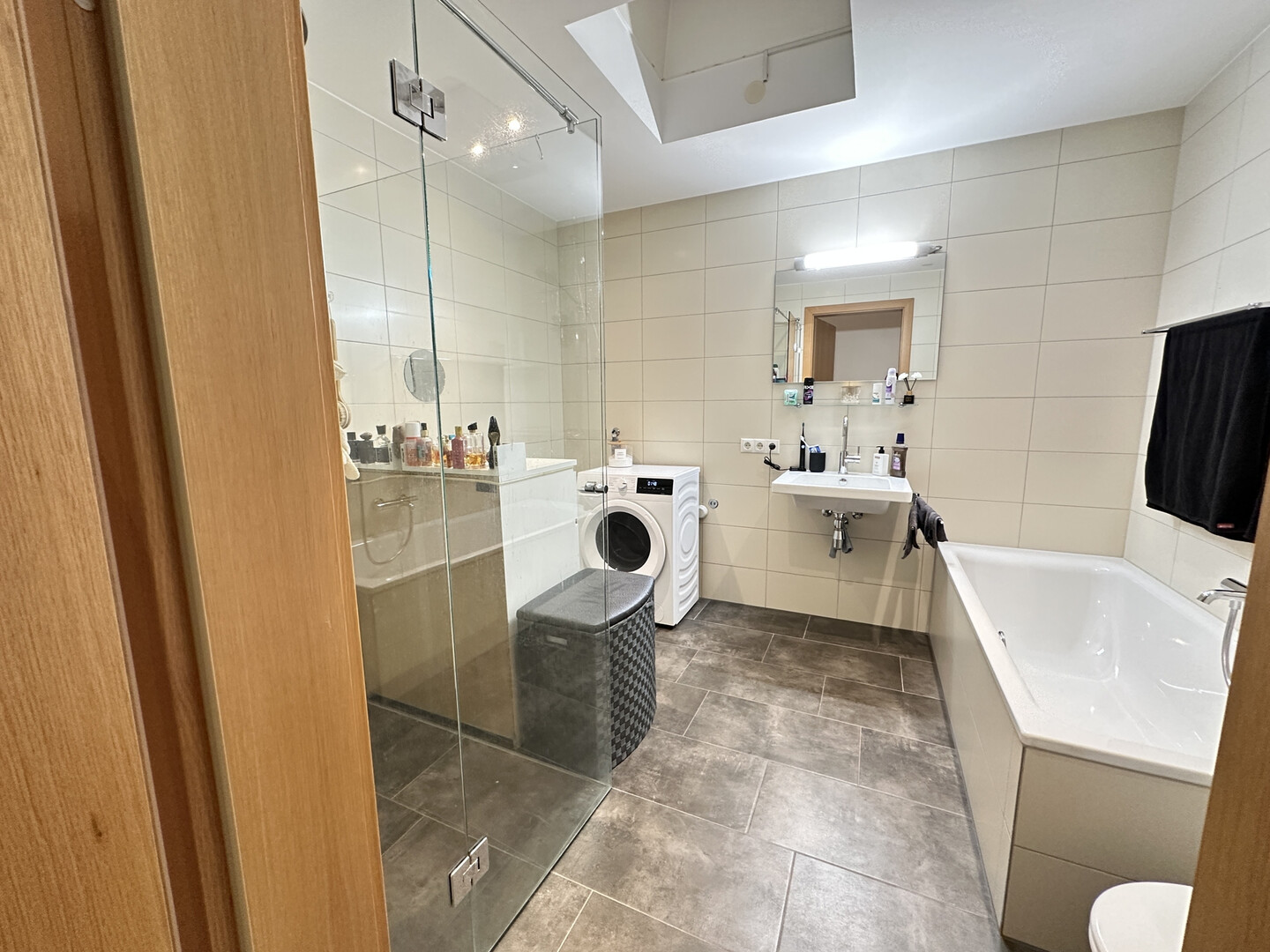 Das Tageslichtbadezimmer verfügt über eine barrierefreie Dusche, eine Badewanne, einen Waschtisch sowie ein WC.