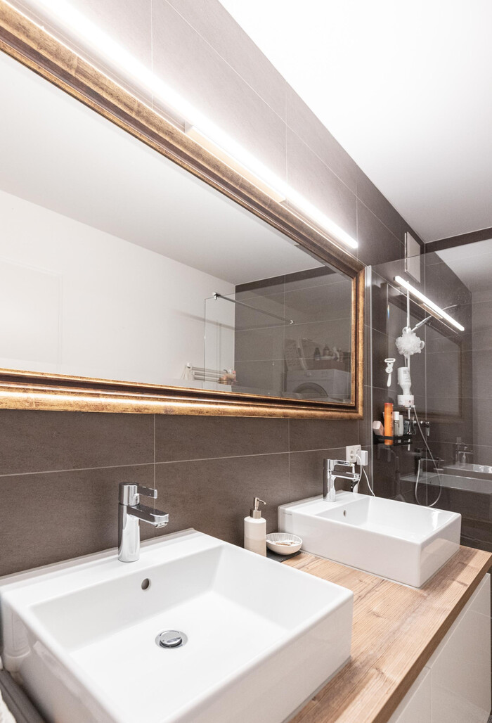 Das stilvolle Badezimmer überzeugt mit Marken-Sanitär von Villeroy & Boch und Hansgrohe, inkl. großformatiger Fliesen und bodenebener Dusche.