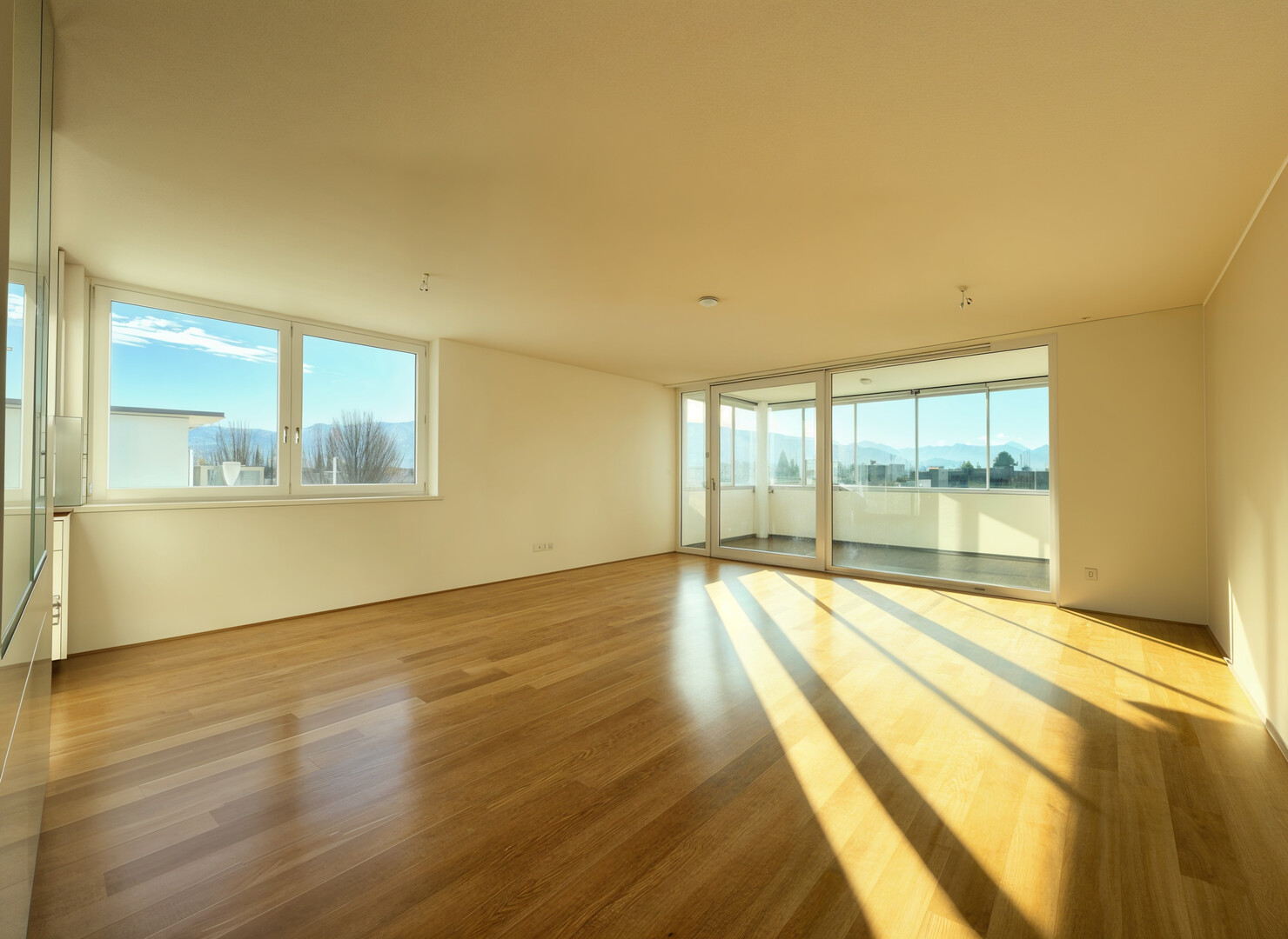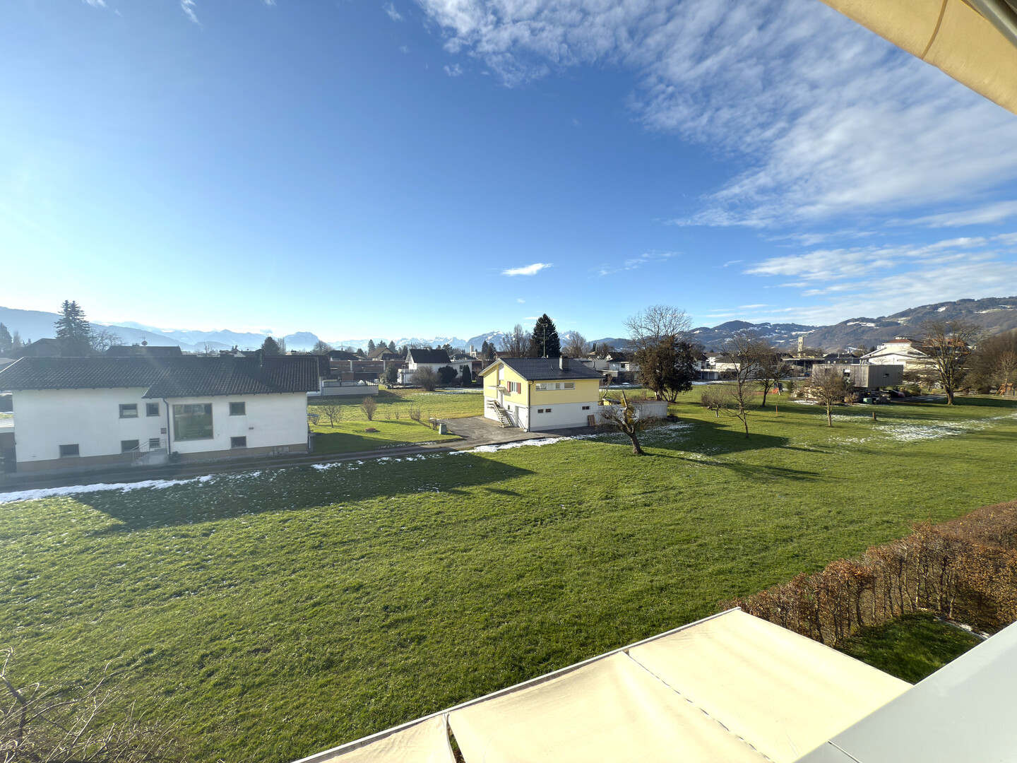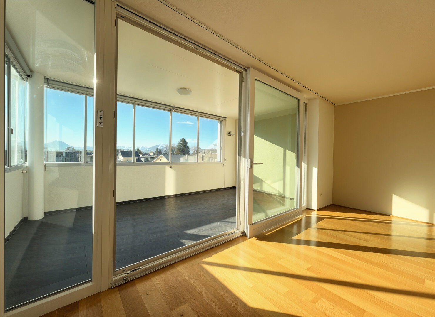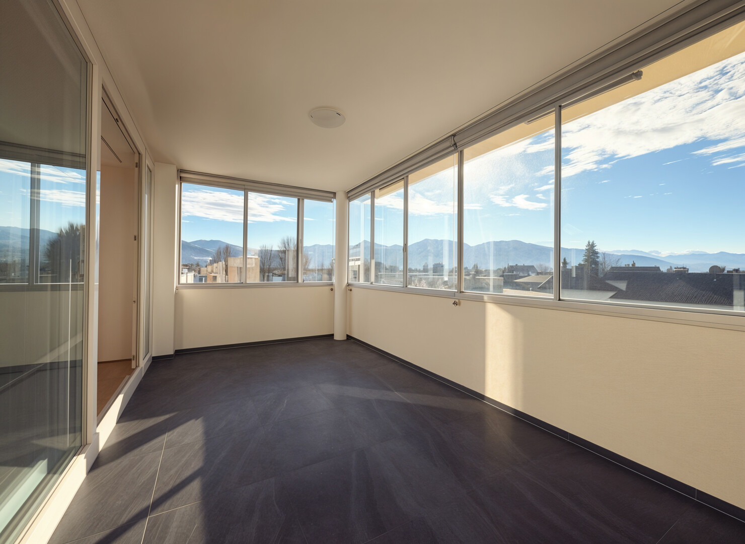 großzügiger, verglaster Balkon mit schöner Aussicht