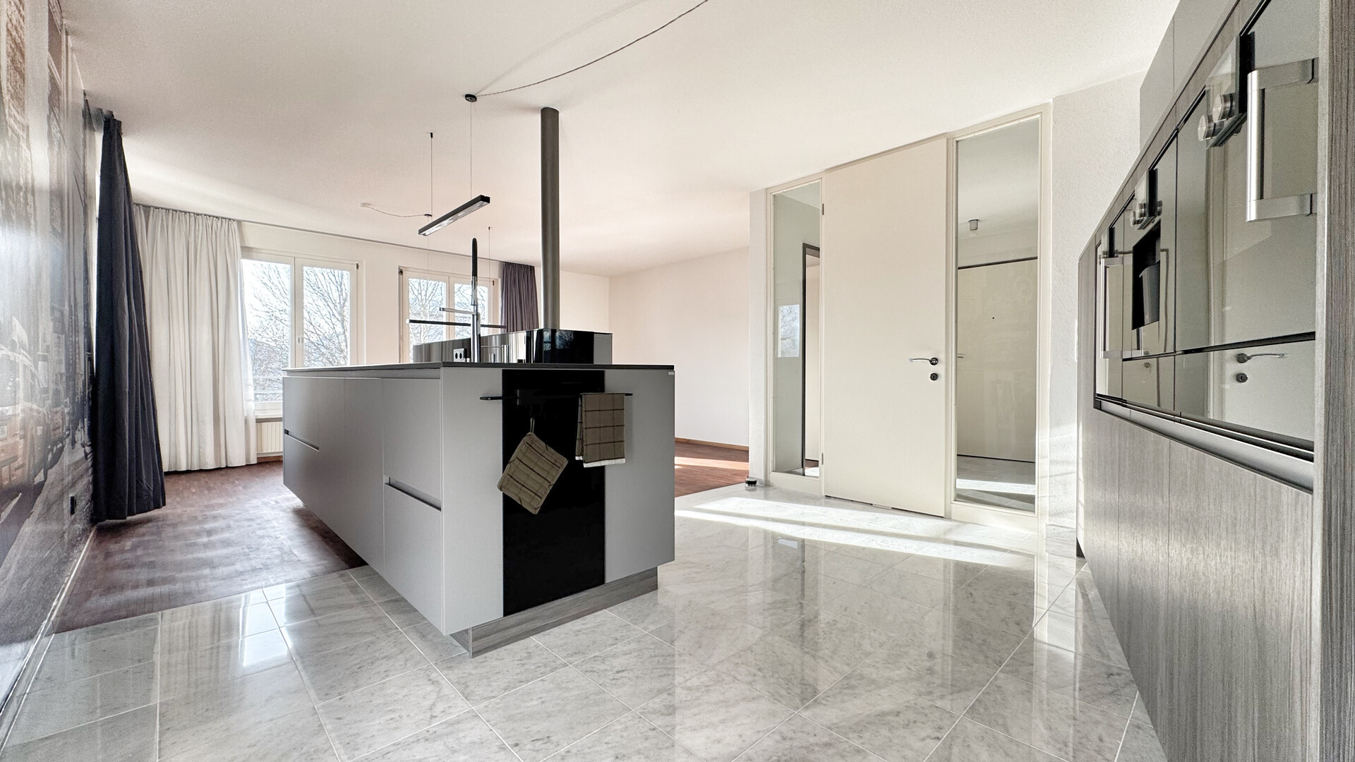 Der Mittelpunkt der Wohnung: Eine edle Gaggenau-Küche für Gourmets und Gelegenheitsköche, inklusive Dampfgarer, Kaffeemaschine und Keramikarbeitsplatte. Offenes Design trifft auf lässige Gastfreundschaft – perfekt für lange Abende und große Pasta-Teller.