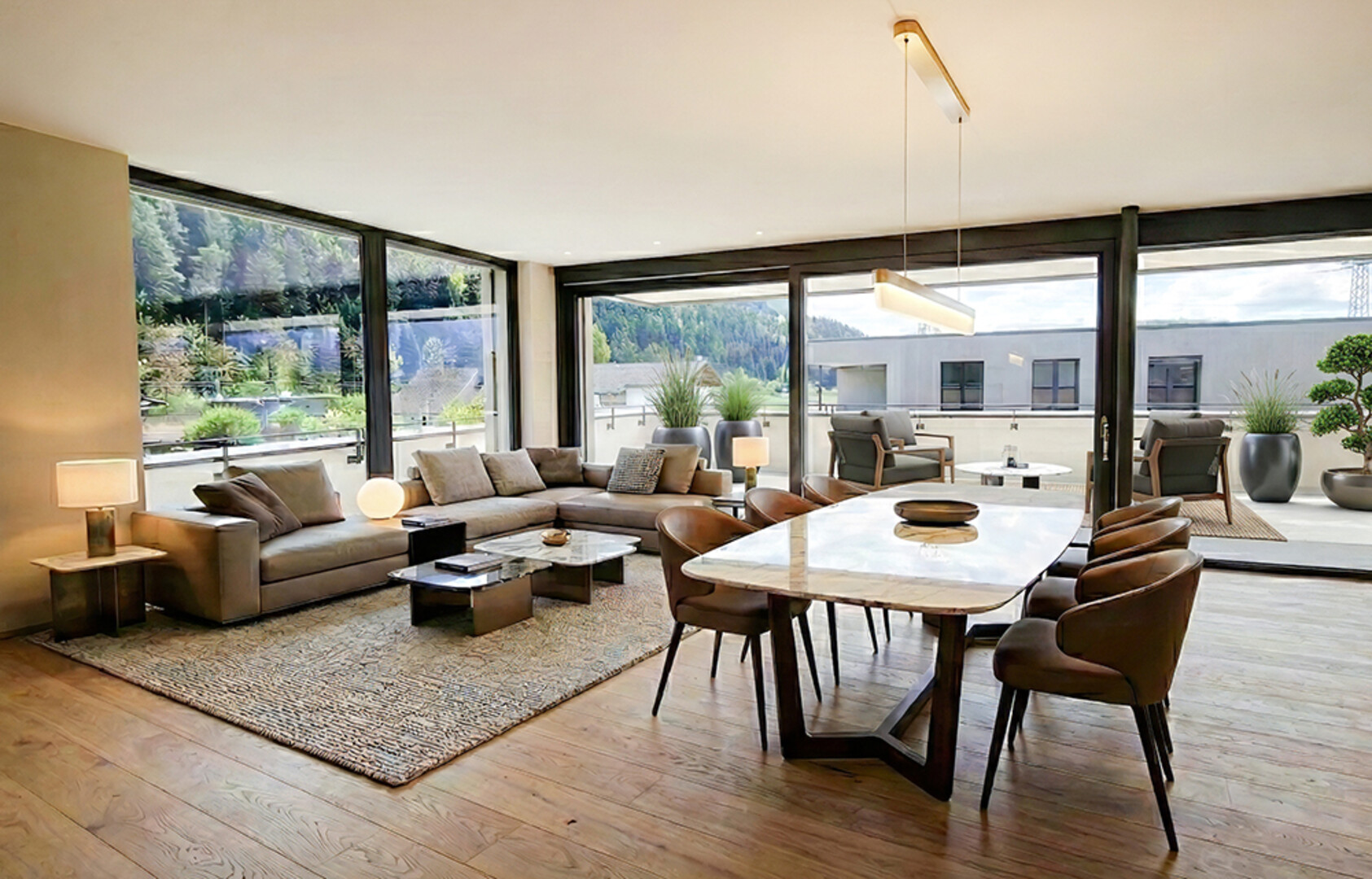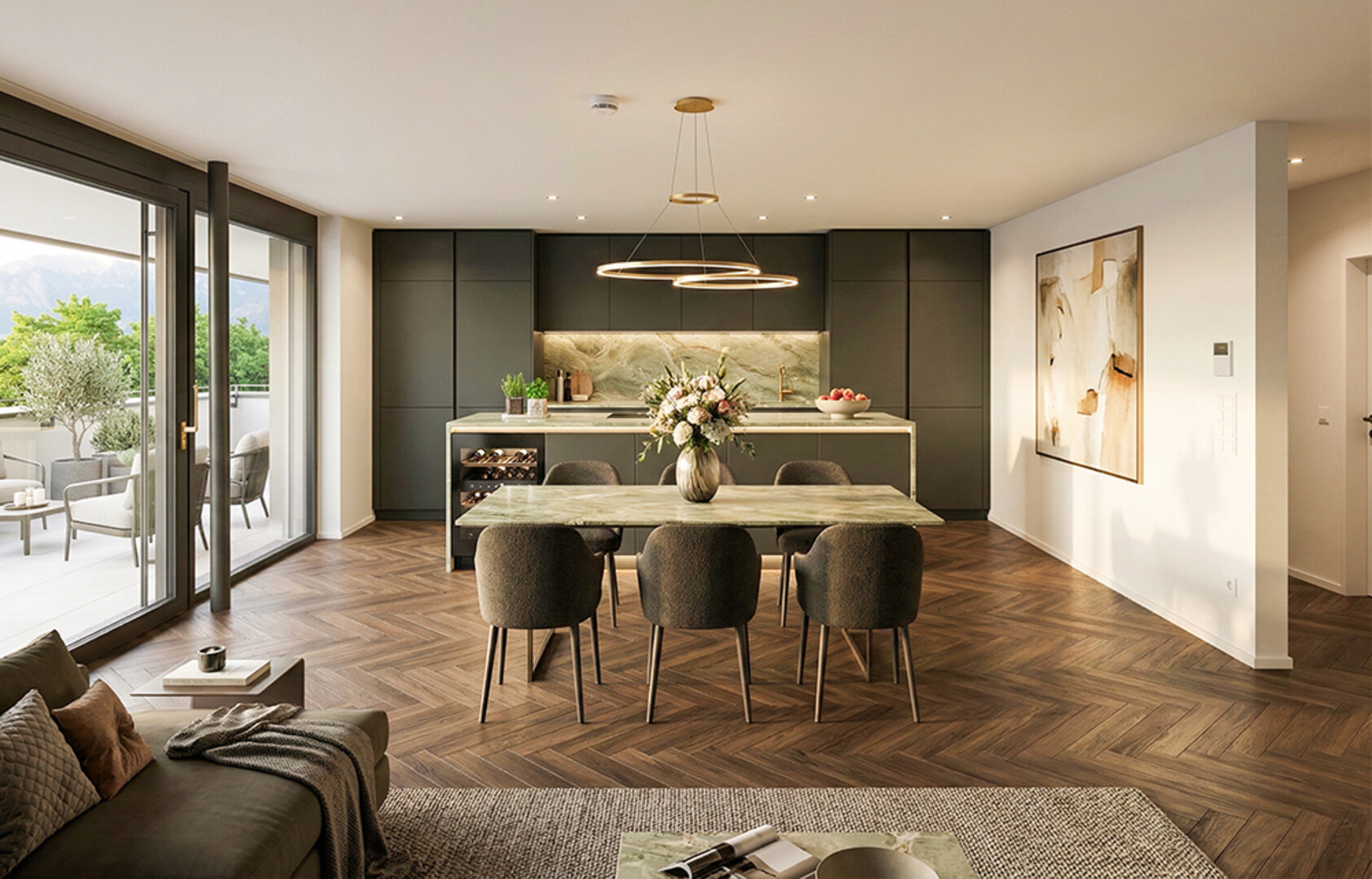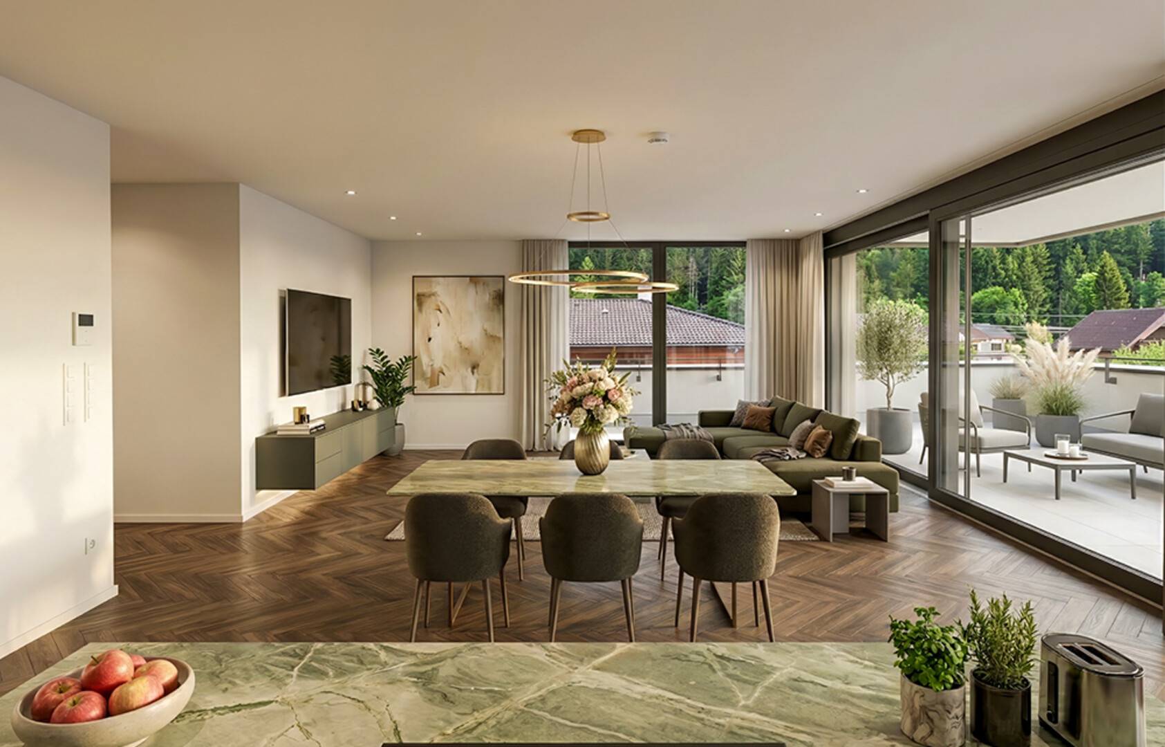 In den Wohnräumen geben raumhohe Fenster den Blick auf die herrlich grüne Umgebung frei. Die offen angelegten Wohn- bzw. Küchenbereiche sind jeweils optimal Richtung Terrasse oder Garten ausgerichtet. Panoramaverglasungen bilden die Verbindung nach draußen und lassen eine helle Wohnatmosphäre entstehen.