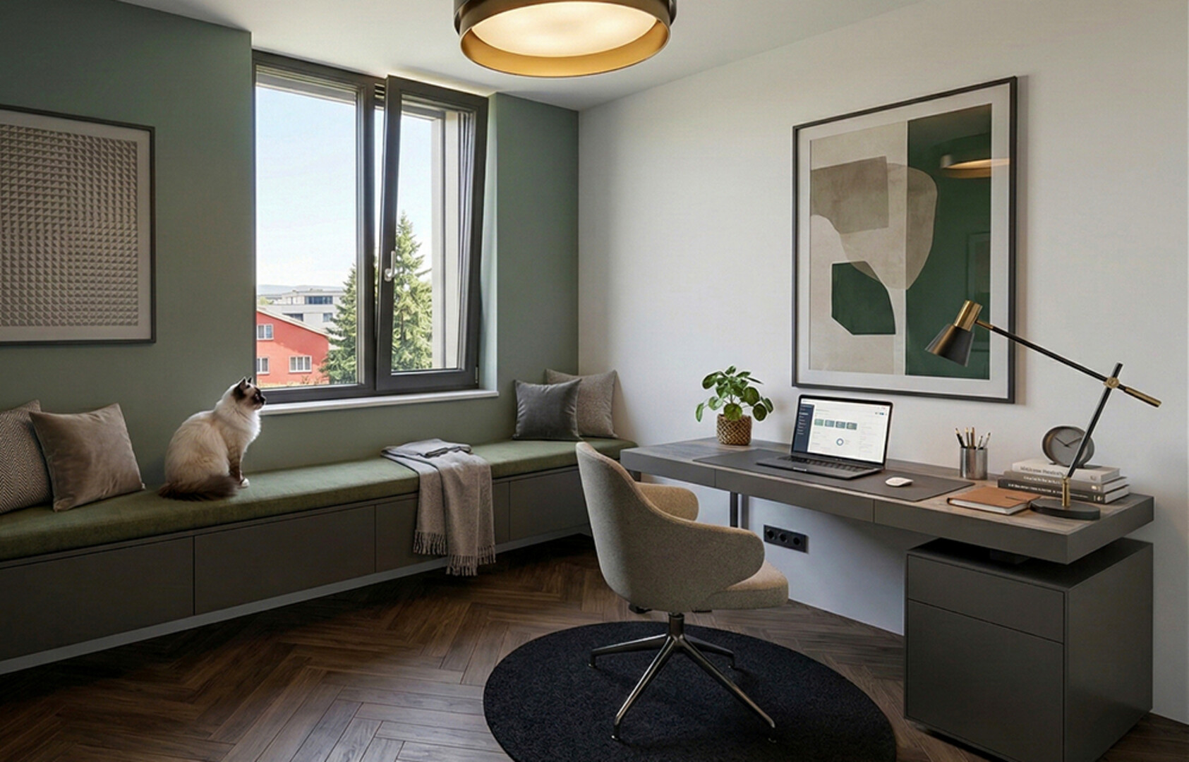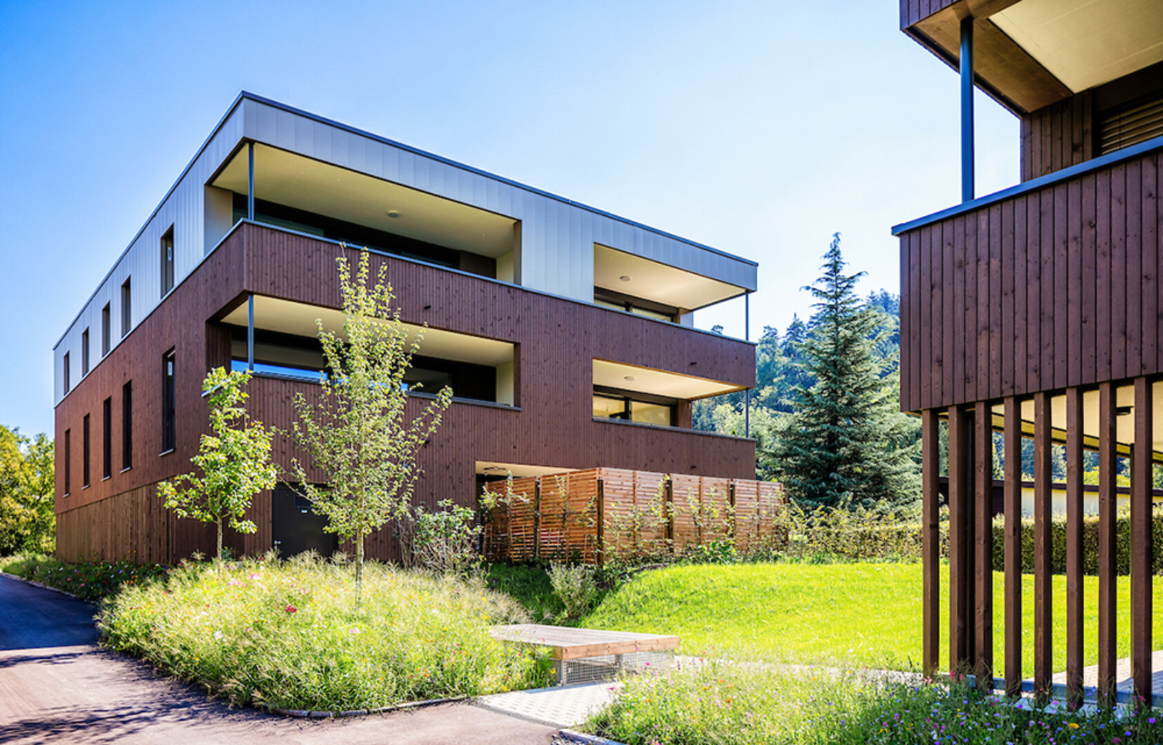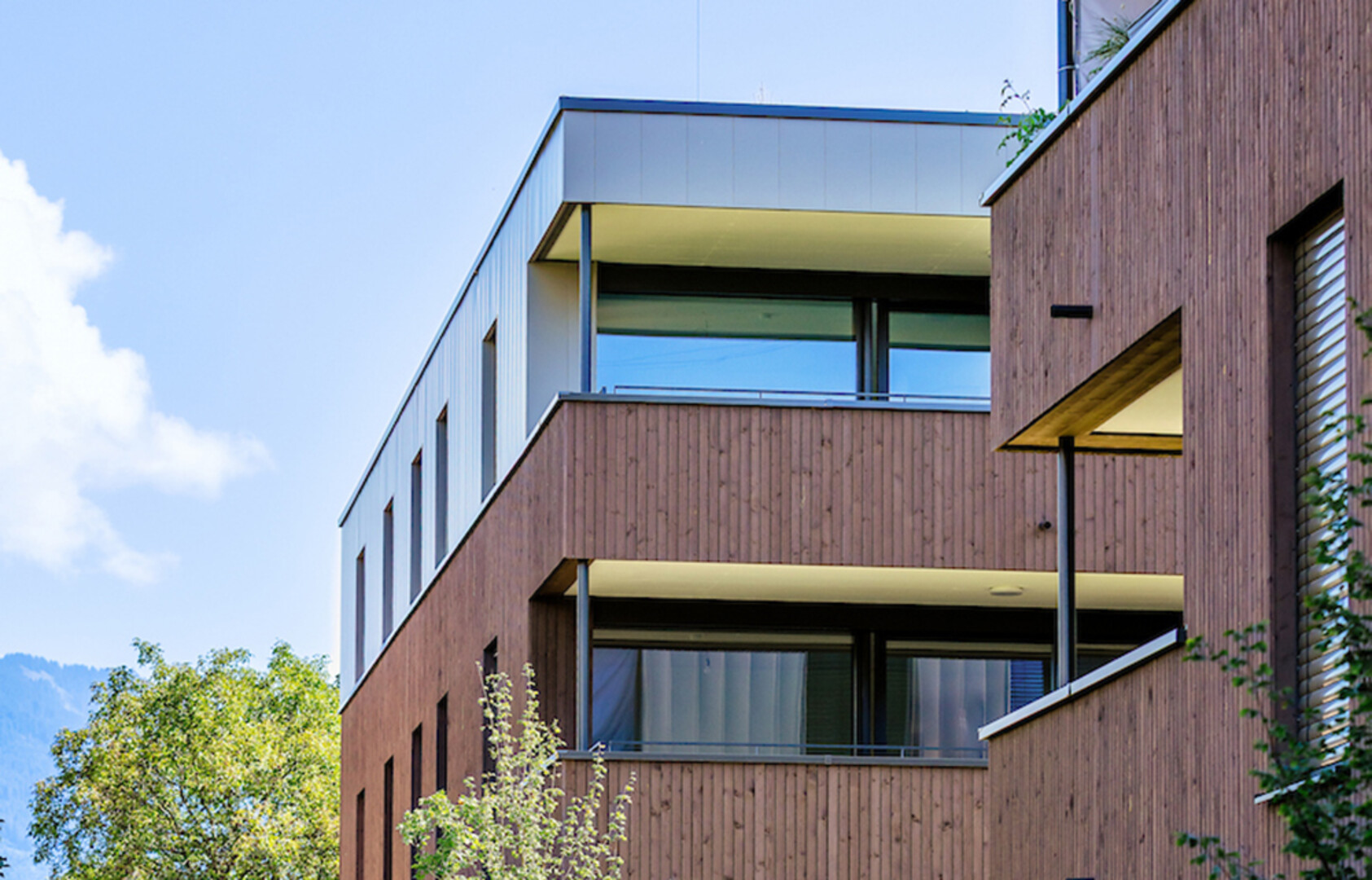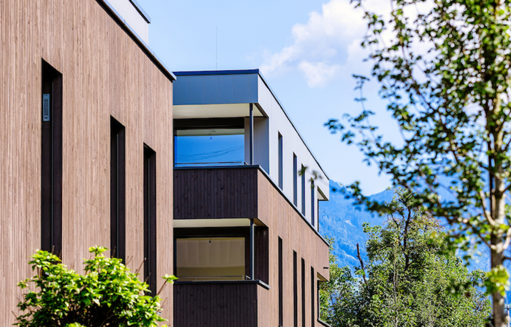 Die verschiedenen Materialisierungen der Fassade bilden einen sanften Kontrast. Im Erdgeschoss und 1. Obergeschoss wird eine Fassadenverkleidung aus Holz mit vertikalen Latten realisiert, das Dachgeschoss wird hingegen mit einer Verkleidung aus Colorblech versehen. Die gemeinsame Tiefgarage, Kellerabteile, Fahrradabstellräume und ein Kinderspielplatz runden das komfortable Wohnkonzept ab.