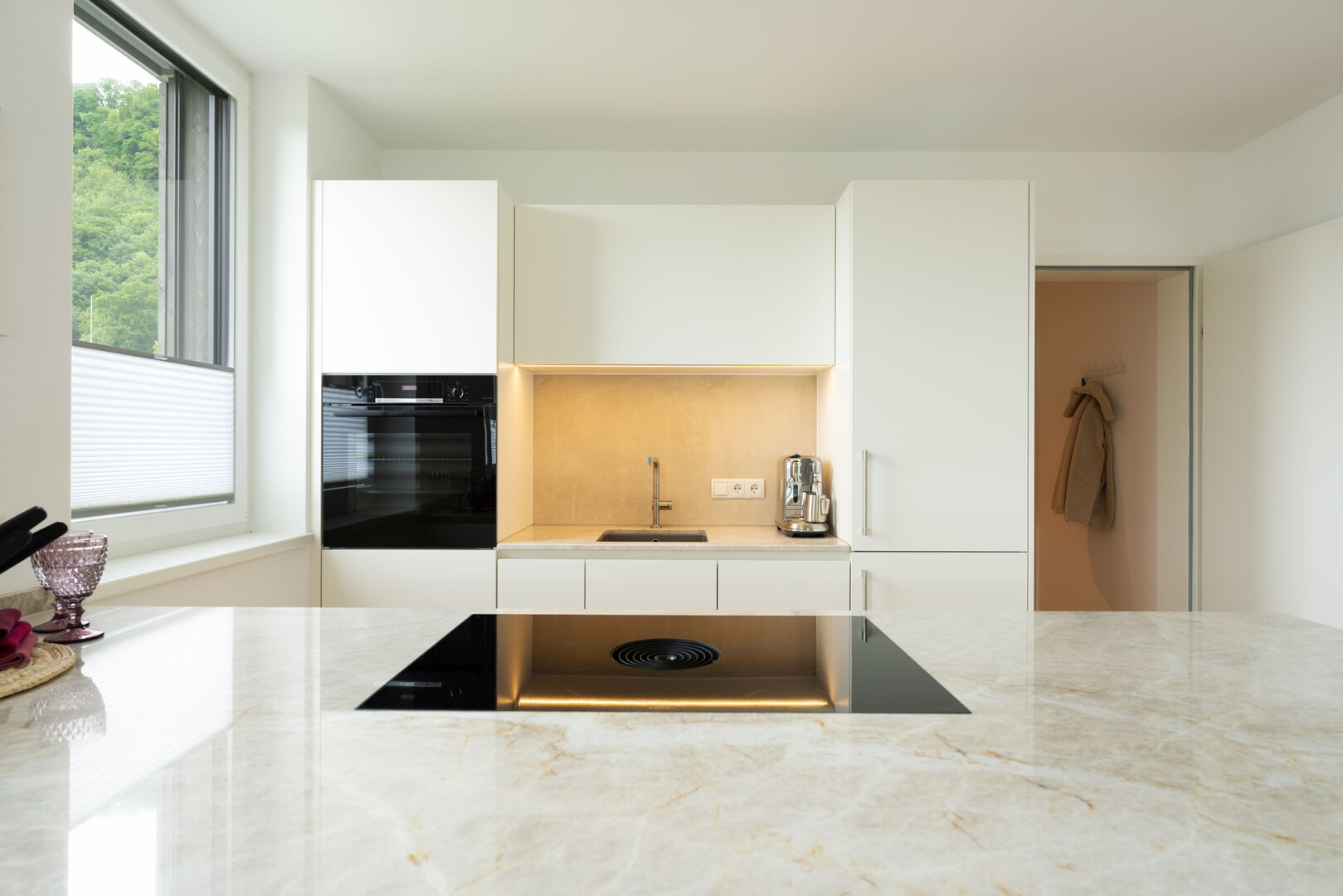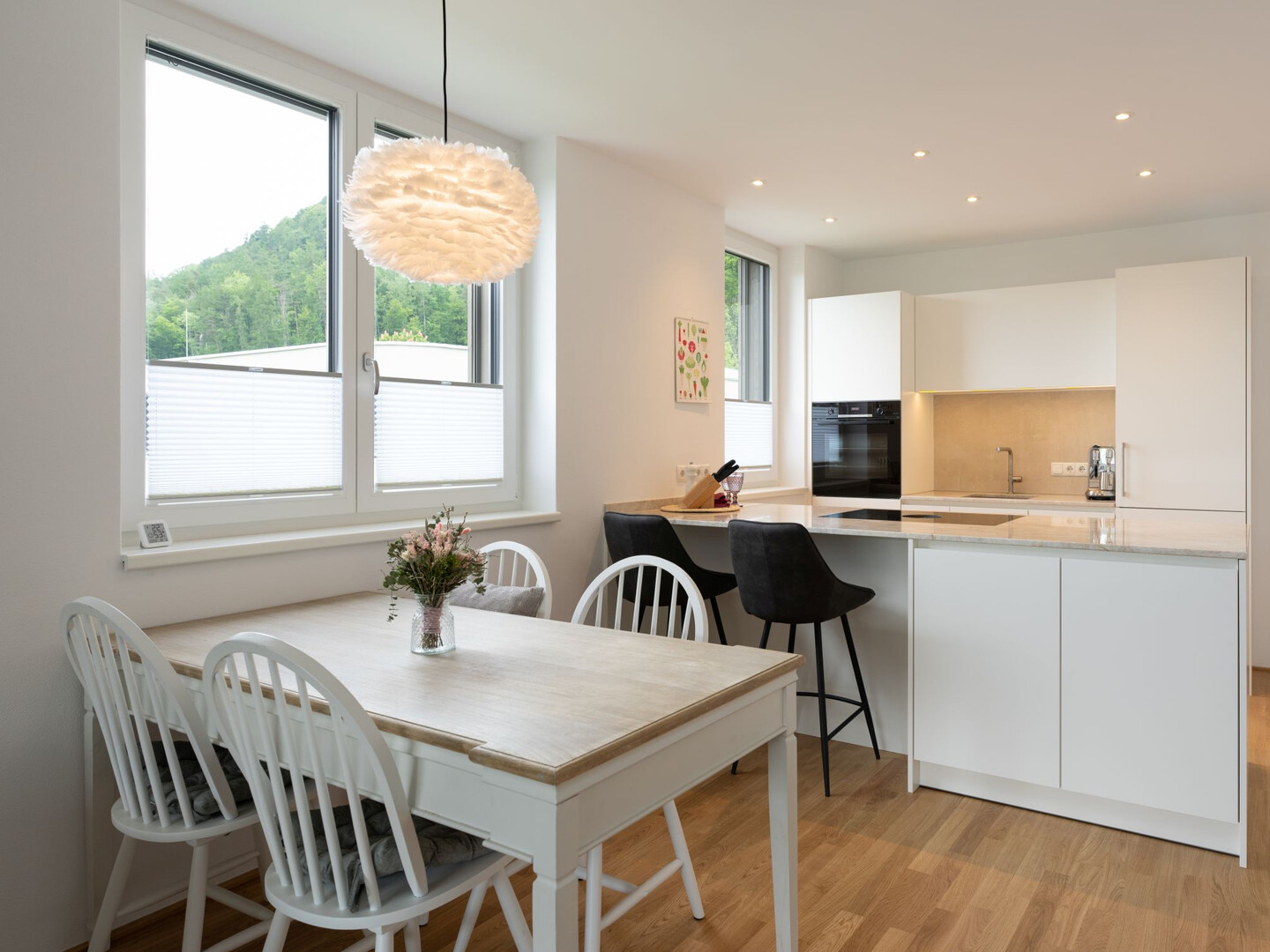 Die Dachgeschosswohnung besitzt zwei überdachte Terrassen mit Ost- und Westausrichtung, welche die Privatsphäre wahren. Die Wohnräume wurden sorgfältig für Liebhaber der Ästhetik eingerichtet. Die moderne Tischlereinbauküche mit Markengeräten lädt mit ihren hochwertigen Arbeitsflächen aus Naturstein zum Kochen und Genießen ein. Die Kochinsel besitzt neben praktischen Aufbewahrungsmöglichkeiten auch einen Sitzbereich samt Barhockern. Das helle Badezimmer besitzt eine Regendusche, das Waschbecken ist in einen schönen Naturstein eingelassen. Im Abstellraum befinden sich ein Regal und eine Waschmaschine mit Trocknerfunktion. Das Schlafzimmer ist großzügig dimensioniert und inkludiert neben Kleideraufbewahrungs-möglichkeiten auch einen Schreibtisch.