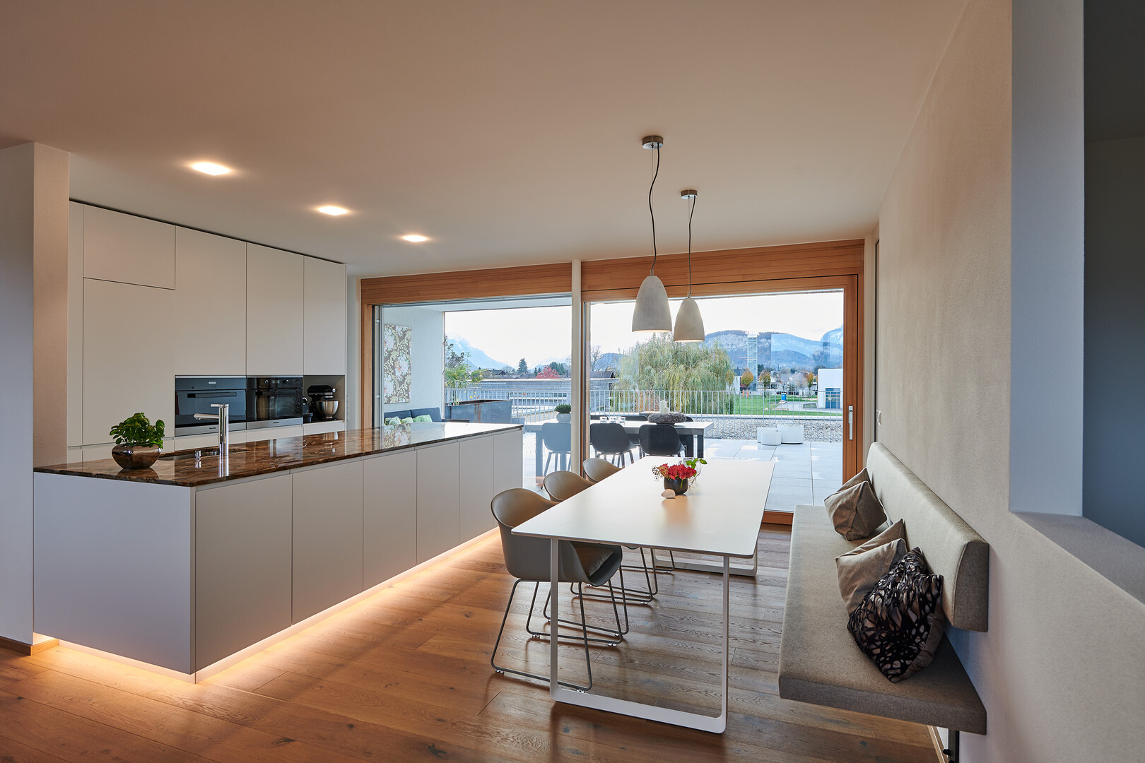 Einbauschränke und Küche wurden vom Tischler in hochwertigen Materialien ausgeführt. Die Einbaugeräte in der Küche sind von Miele.