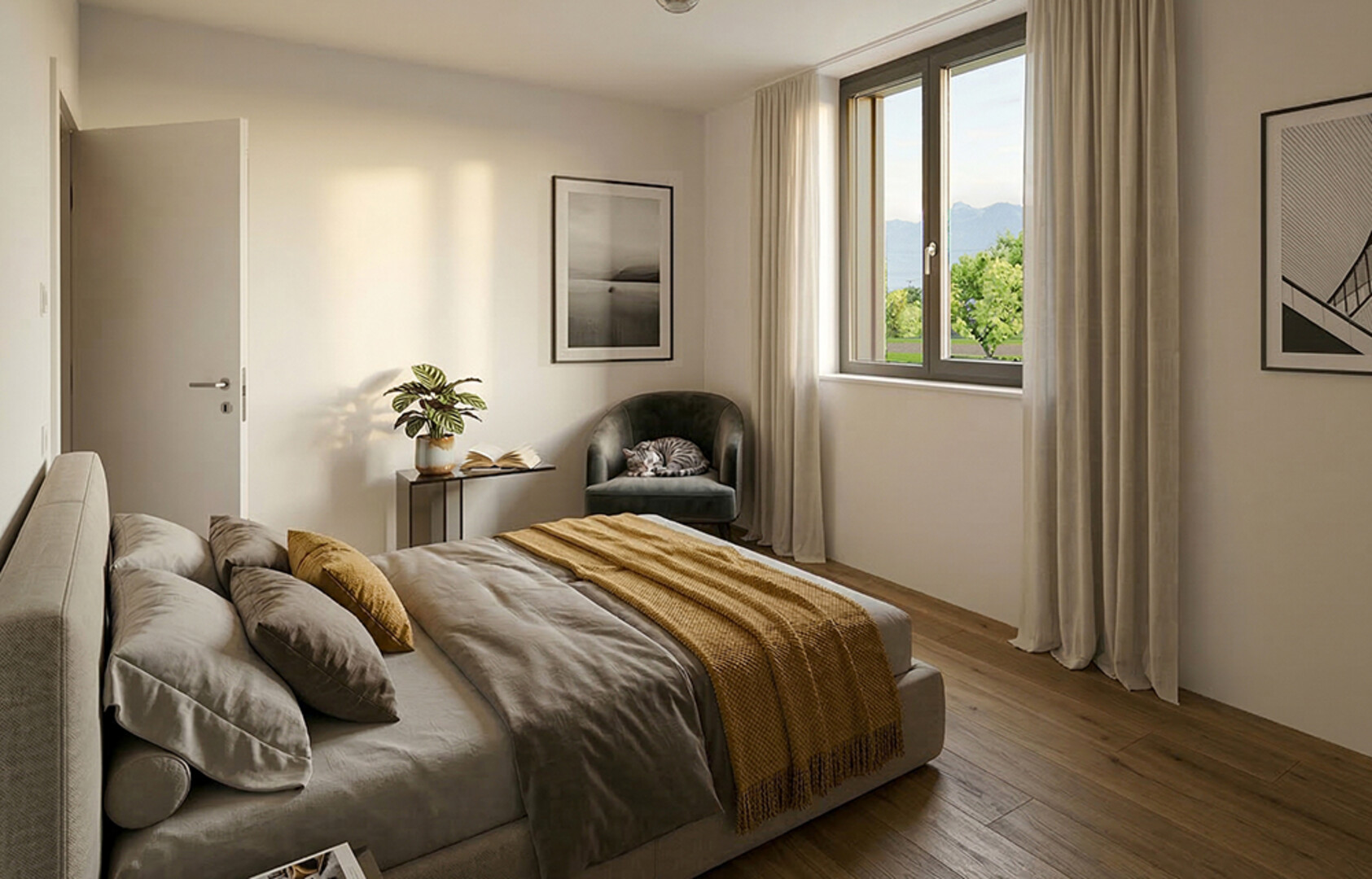 In den Wohnräumen geben raumhohe Fenster den Blick auf die herrlich grüne Umgebung frei. Die offen angelegten Wohn- bzw. Küchenbereiche sind jeweils optimal Richtung Terrasse oder Garten ausgerichtet. Panoramaverglasungen bilden die Verbindung nach draußen und lassen eine helle Wohnatmosphäre entstehen.