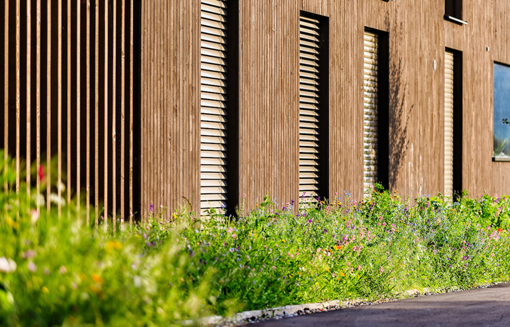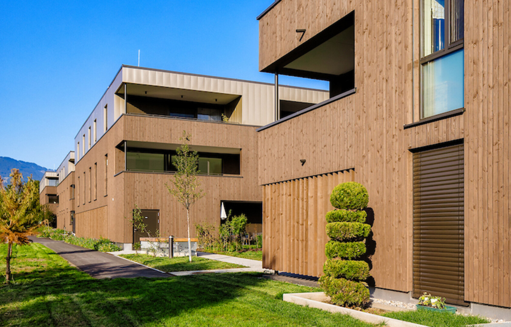 Die verschiedenen Materialisierungen der Fassade bilden einen sanften Kontrast. Im Erdgeschoss und 1. Obergeschoss wird eine Fassadenverkleidung aus Holz mit vertikalen Latten realisiert, das Dachgeschoss wird hingegen mit einer Verkleidung aus Colorblech versehen. Die gemeinsame Tiefgarage, Kellerabteile, Fahrradabstellräume und ein Kinderspielplatz runden das komfortable Wohnkonzept ab.