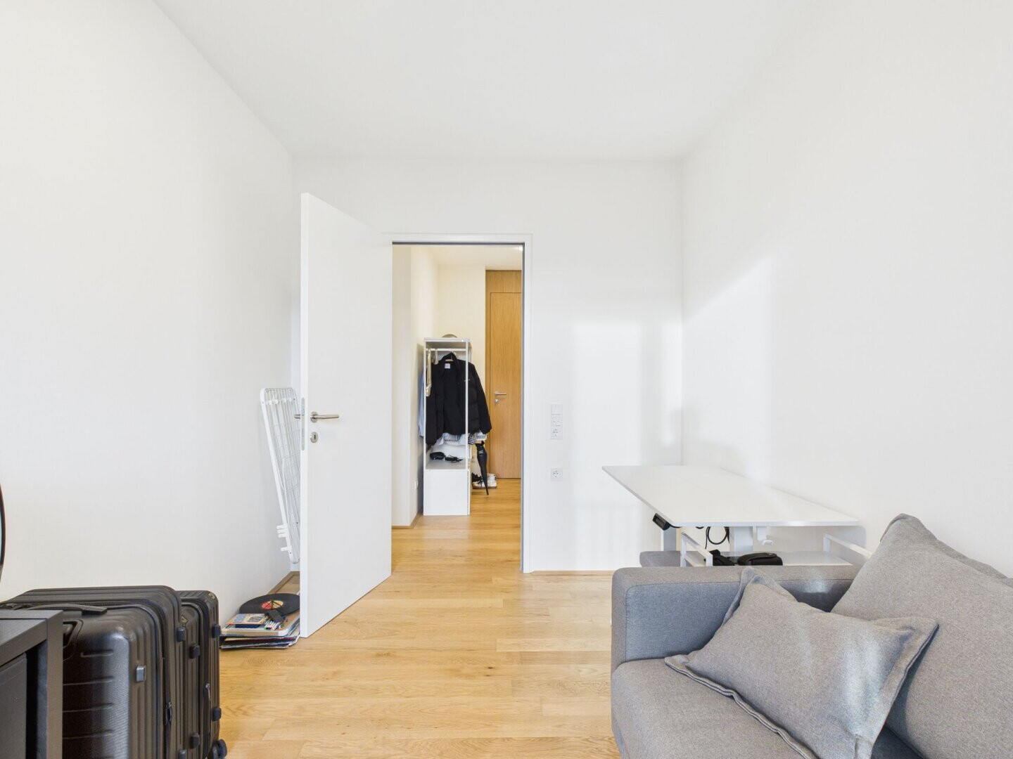 Edler Parkettboden in den Wohnräumen, zeitlose Fliesen im Badezimmer sowie große bodentiefe Fenster sorgen für ein helles, angenehmes Ankommen. Die eleganten Holz-Alu-Fenster unterstreichen den hochwertigen Charakter, während die Beschattung mittels Screens auf der Loggia für optimalen Komfort sorgt.
