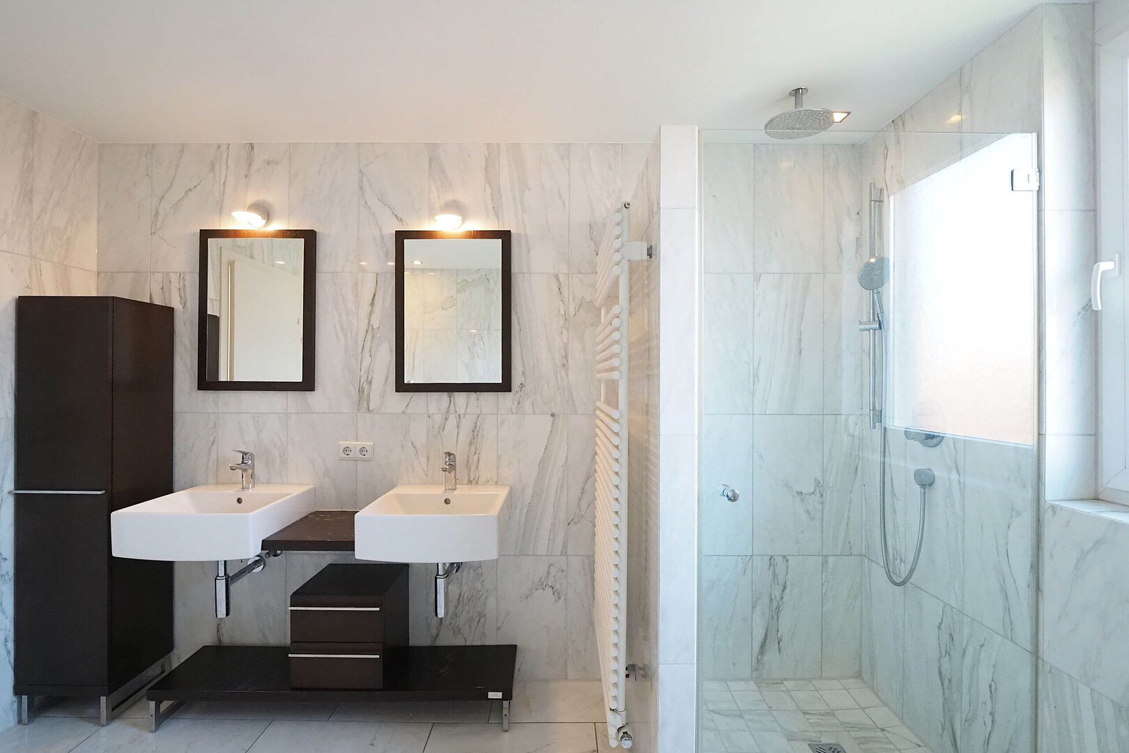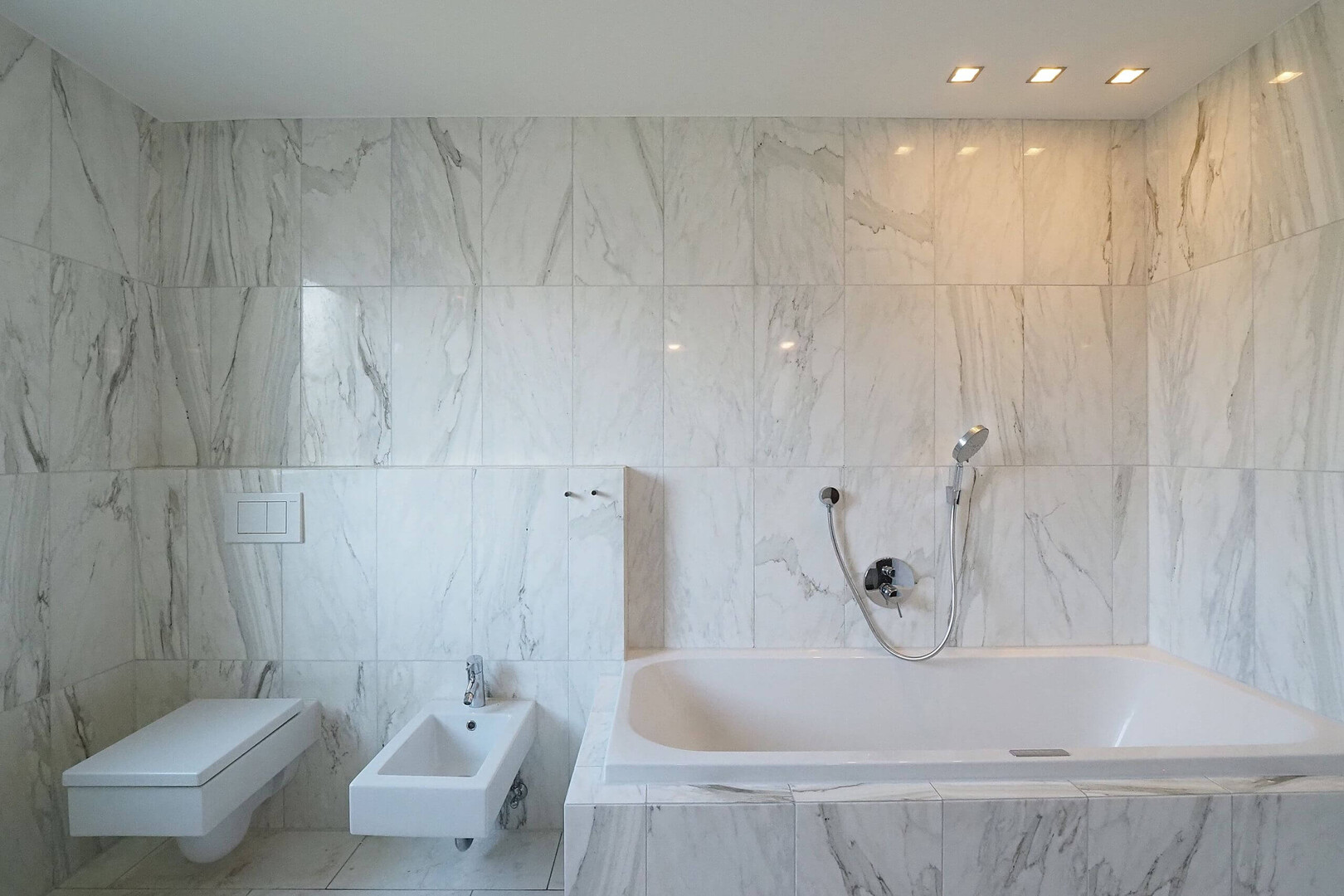 Das edle Tageslicht-Badezimmer ist mit Whirlpool-Badewanne, Dusche, WC, Bidet und Doppelwaschbecken ausgestattet – eine echte Wellness-Oase für Zuhause.