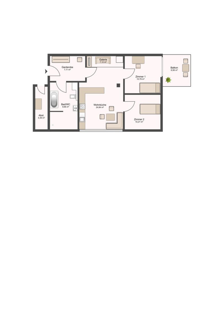 Zur Wohnung zugehörig sind eine Diele, ein Badezimmer mit WC, eine Küche mit Wohn-Essbereich, eine Galerie, zwei Schlafzimmer, ein Abstellraum sowie ein Kellerabteil. Besonders die Galerie verleiht diesem Raumwunder ein besonderes Flair. Ein gemütlicher Balkon lädt zum Verweilen ein.