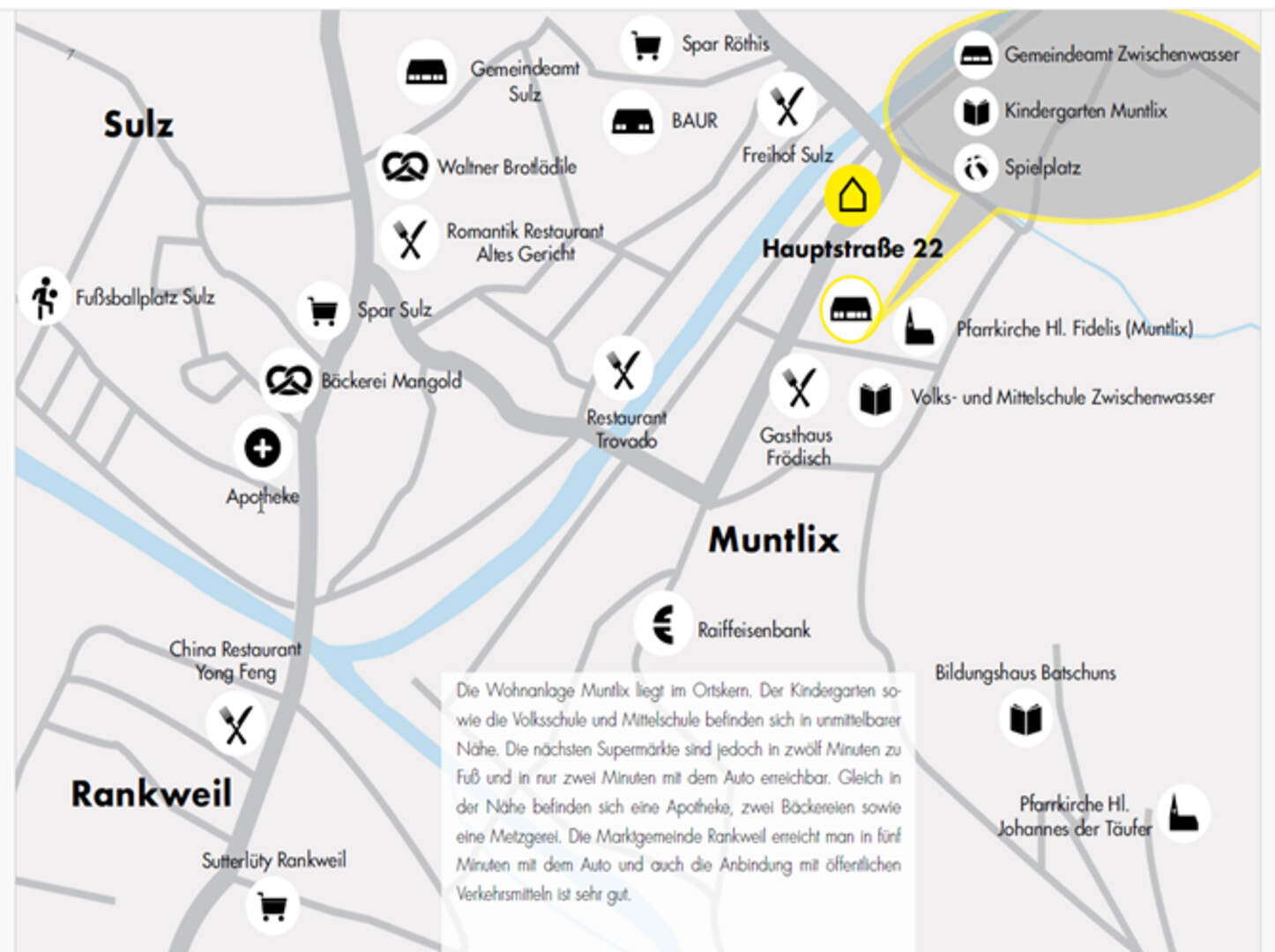 Die Umgebung bietet eine ruhige und grüne Wohngegend im Zentrum von Muntlix, ideal für Erholungssuchende. In der Nähe finden Sie neben Einkaufsmöglichkeiten, Restaurants (Freihof Sulz, Pizzeria Trovado, GH Sternbräu) auch eine Arztpraxis, Anbindung an öffentliche Verkehrsmittel sind ebenso gegeben.