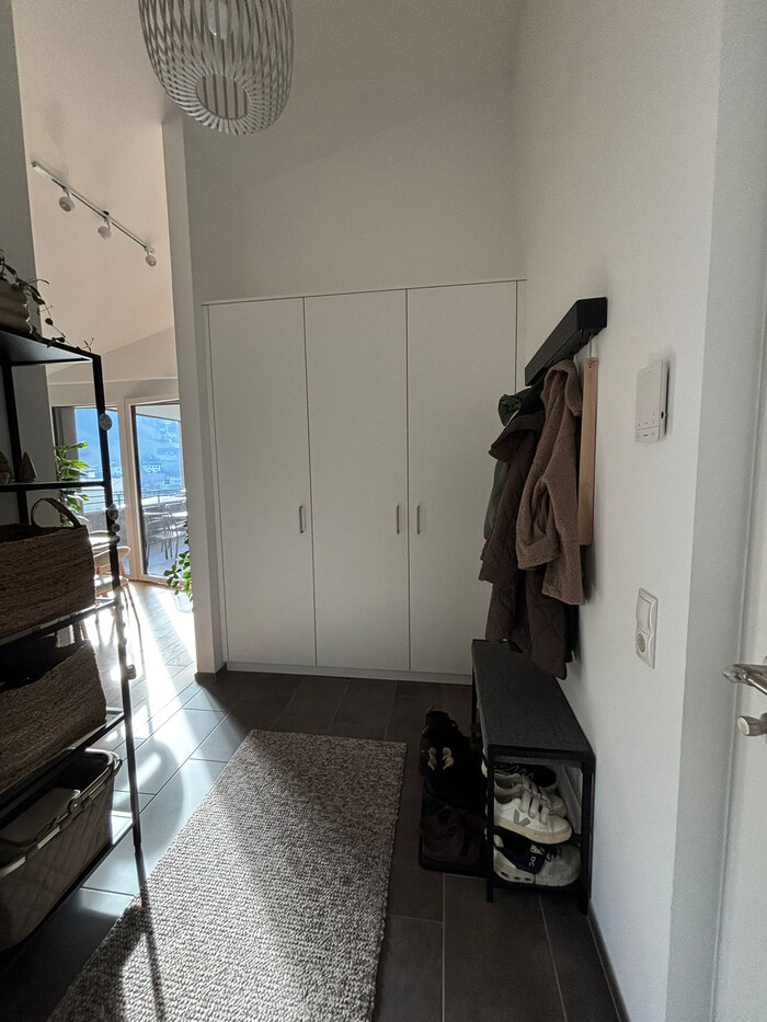 Im Inneren erwartet Sie ein modernes und helles Wohnambiente. Die offene, moderne Wohnküche lädt zum Kochen und Entspannen ein. Geschirrspüler, Backofen - sowie ein moderner Kühlschrank ist Bestandteil der fast neuwertigen Einbauküche. Das Schlafzimmer bietet ausreichend Platz und Ruhe. Das Badezimmer ist mit hochwertigen Armaturen ausgestattet und verfügt über eine großzügige Dusche. Im Eingangsbereich ist ein praktischer Einbauschrank verbaut. Sämtliche Beleuchtungskörper sind bereits montiert und gehöhren zur Wohnung.