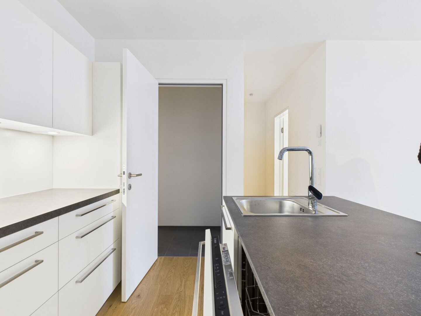 Die Ausstattung umfasst eine hochwertige Einbauküche mit Kücheninsel, Fußbodenheizung mit Einzelraumsteuerung sowie ein stilvolles Badezimmer mit Walk-in-Dusche. Die überdachte Loggia lädt dazu ein, entspannte Stunden in der Abendsonne zu genießen.
