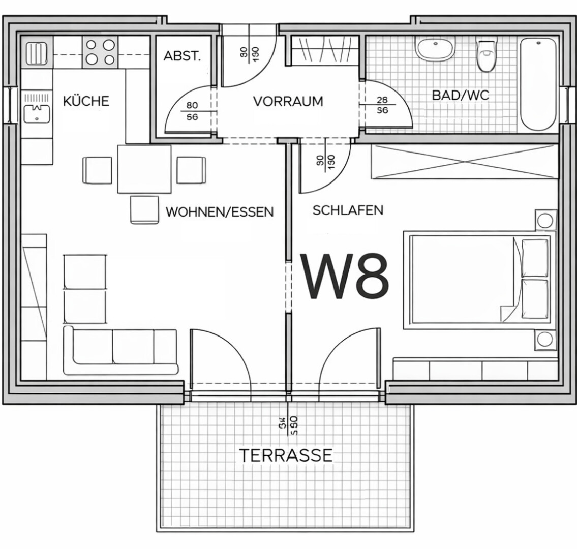 Die Wohnung in der Schleife 11 in Rankweil befindet sich im Dachgeschoss und verfügt über eine Wohnfläche von 48,97 m² (davon sind 6 m² unter 1,80 Meter Raumhöhe). Ein schöner Balkon mit 8 m² ist nach Süd-Westen und ebenso wie die gesamte Wohnung zum ruhigen Innenhof mit Blick auf die Basilika ausgerichtet. Die Wohnungen und Geschäftsflächen werden über das lokale Fernwärmenetz effizient und umweltfreundlich beheizt.