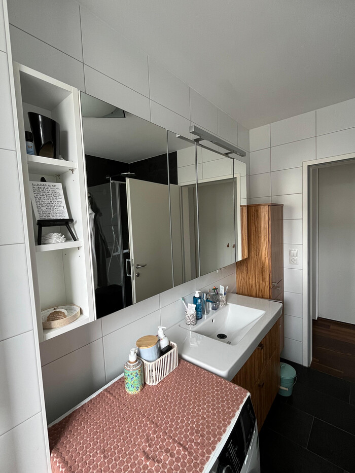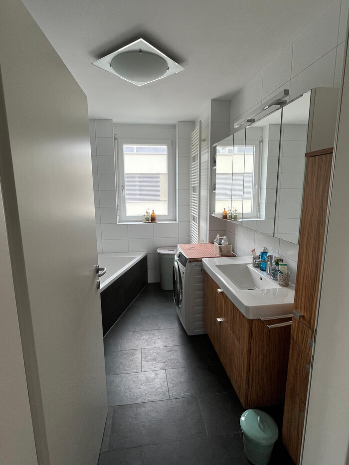 Die Wohnung wird unmöbliert vermietet (Einbauschrank im Schlafzimmer, Badezimmerschränke, Küche, Deckenlampen, Garderobenbereich bleiben wie abgebildet).