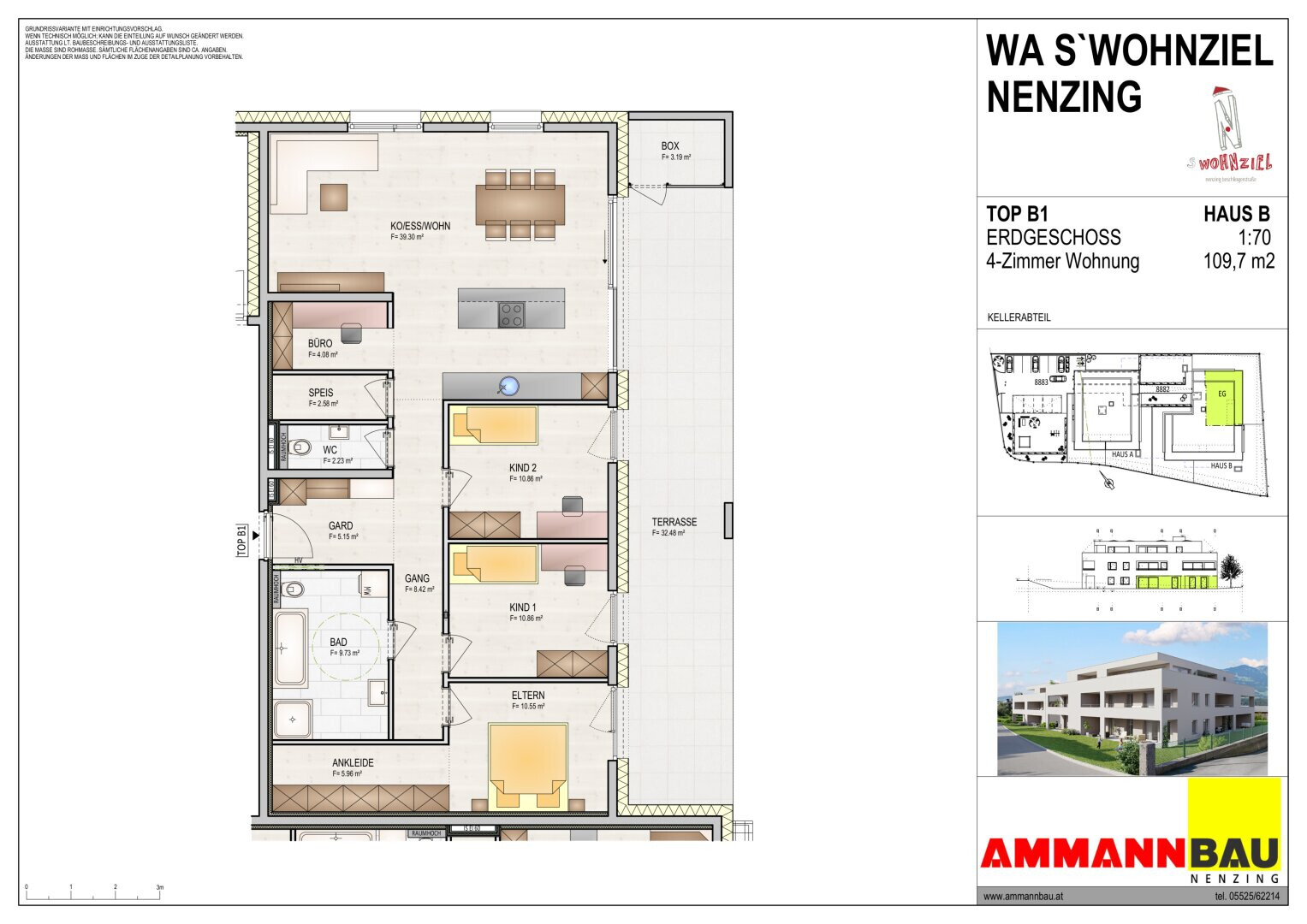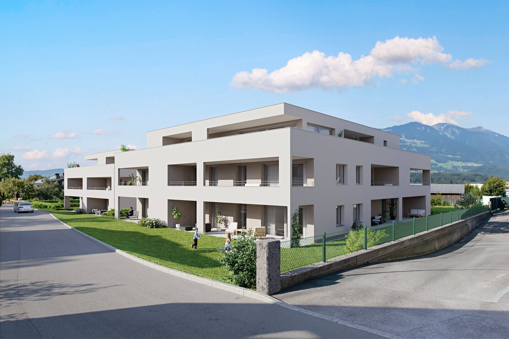 Ammann Wohnbau errichtet in Nenzing Beschlingerstraße/Tannenbildstraße in gewohnter Wohnqualität Wohnungen zum wohlfühlen. Die vom Architekturbüro Atelier Rainer+Amann geplante Wohnanlage besticht durch moderne, zeitlos schöne Architektur. Nur 17 Einheiten versprechen ein ungewohntes Wohngefühl einer Wohnanlage. Die Wohnungen sind über einen Personenlift barrierefrei zugänglich. Die Wohnungen im Erdgeschoss verfügen über einen eigenen Gartenanteil. Stellplätze für Besucher befinden sich im Außenbereich der Anlage, die Einstellplätze befinden sich in der Tiefgarage welche um € 23.000.- zusätzlich erworben werden können.
