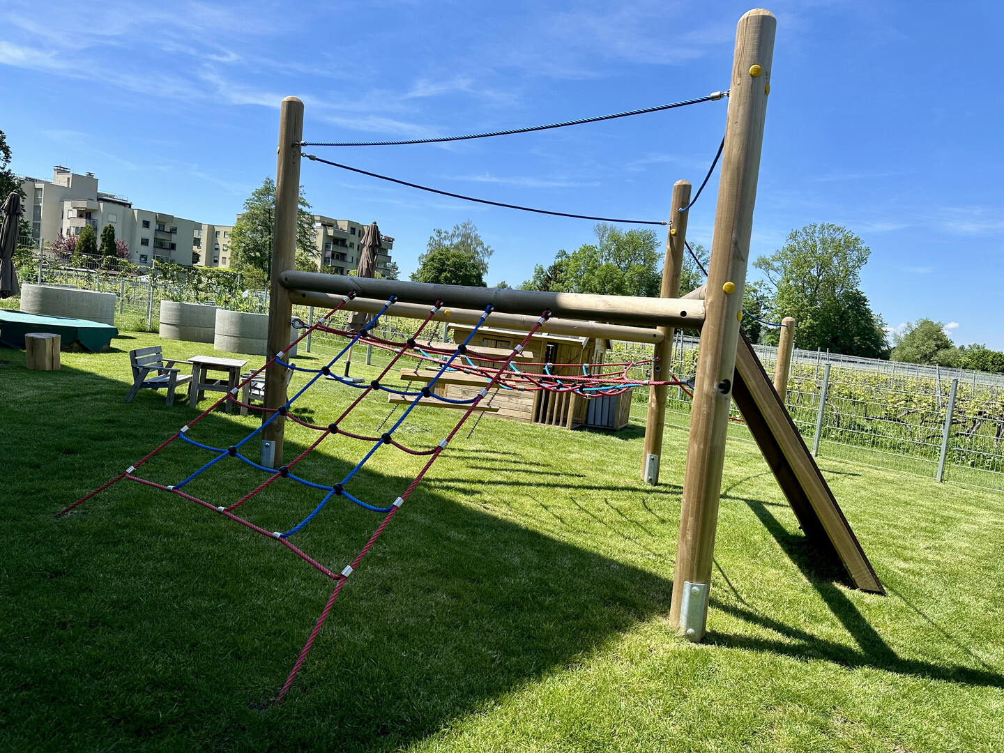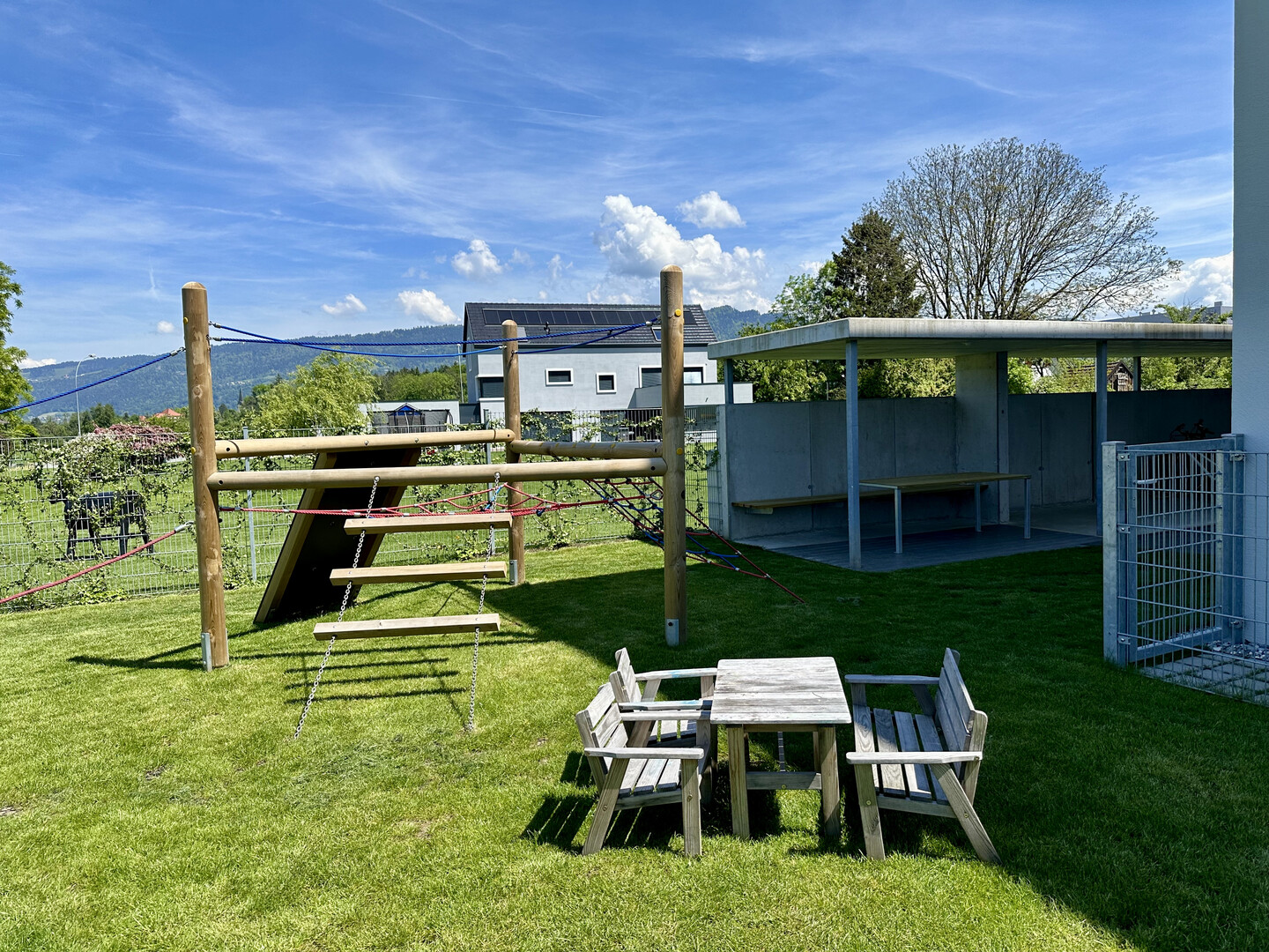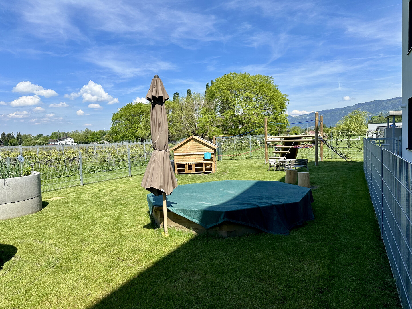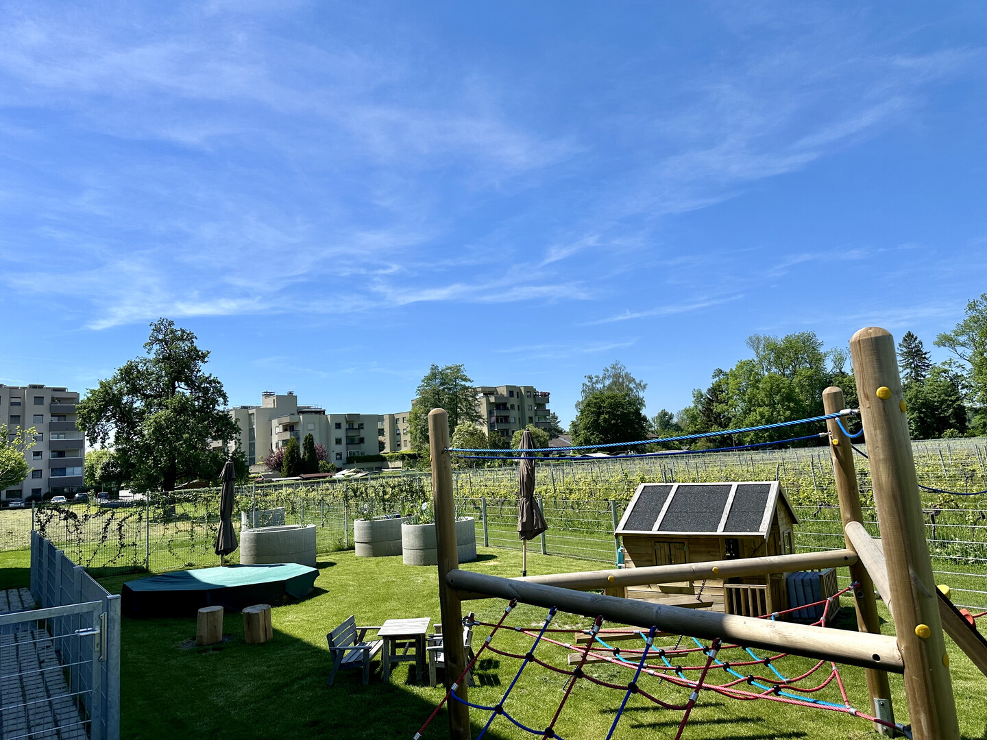 Parallel zum Weingarten gibt es beim Haupteingang einen großzügigen Spielplatz mit überdachter Sitzbank zum Verweilen. Dort befindet sich pro Wohnung auch ein kleines Hochbeet, welches auf Wunsch bepflanzt werden kann.