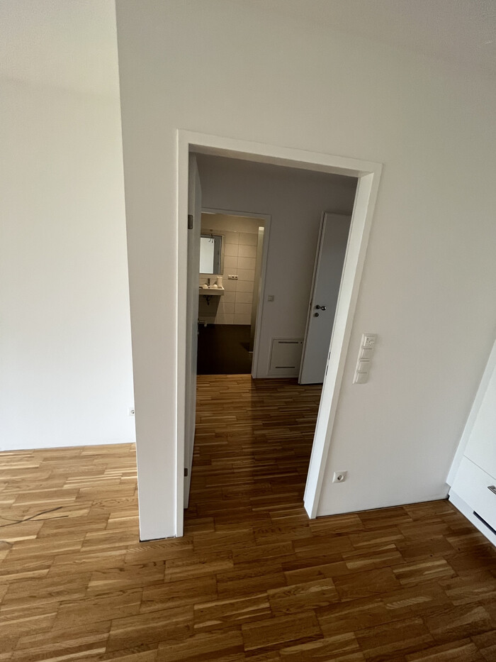 Die Böden im Wohn- und Schlafzimmer sind mit einem schönen Echtholzparket ausgestattet. Das Badezimmer ist verfliest (Boden grau, Wände weiß) und verfügt über eine bodengleich geflieste Dusche. Das WC und der Waschmaschinenanschluss befinden sich im Badezimmer.