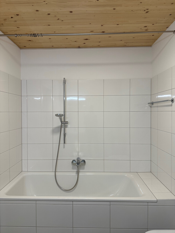 Großes Badezimmer mit Badewanne, WC und Waschmaschinenanschluss