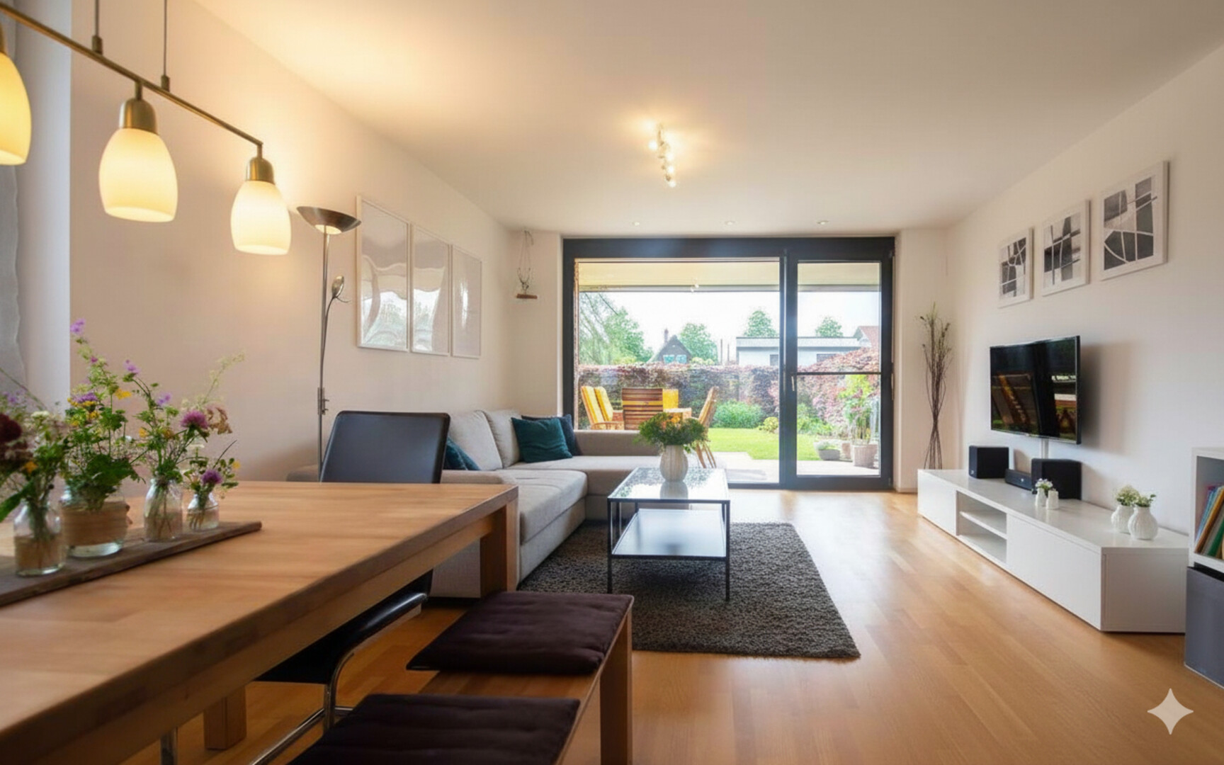 Die Wohnung überzeugt durch einen praktischen Grundriss, helle Räume und einen direkten Zugang in den Garten. Die Lage verbindet Natur, Freiraum und optimale Infrastruktur: